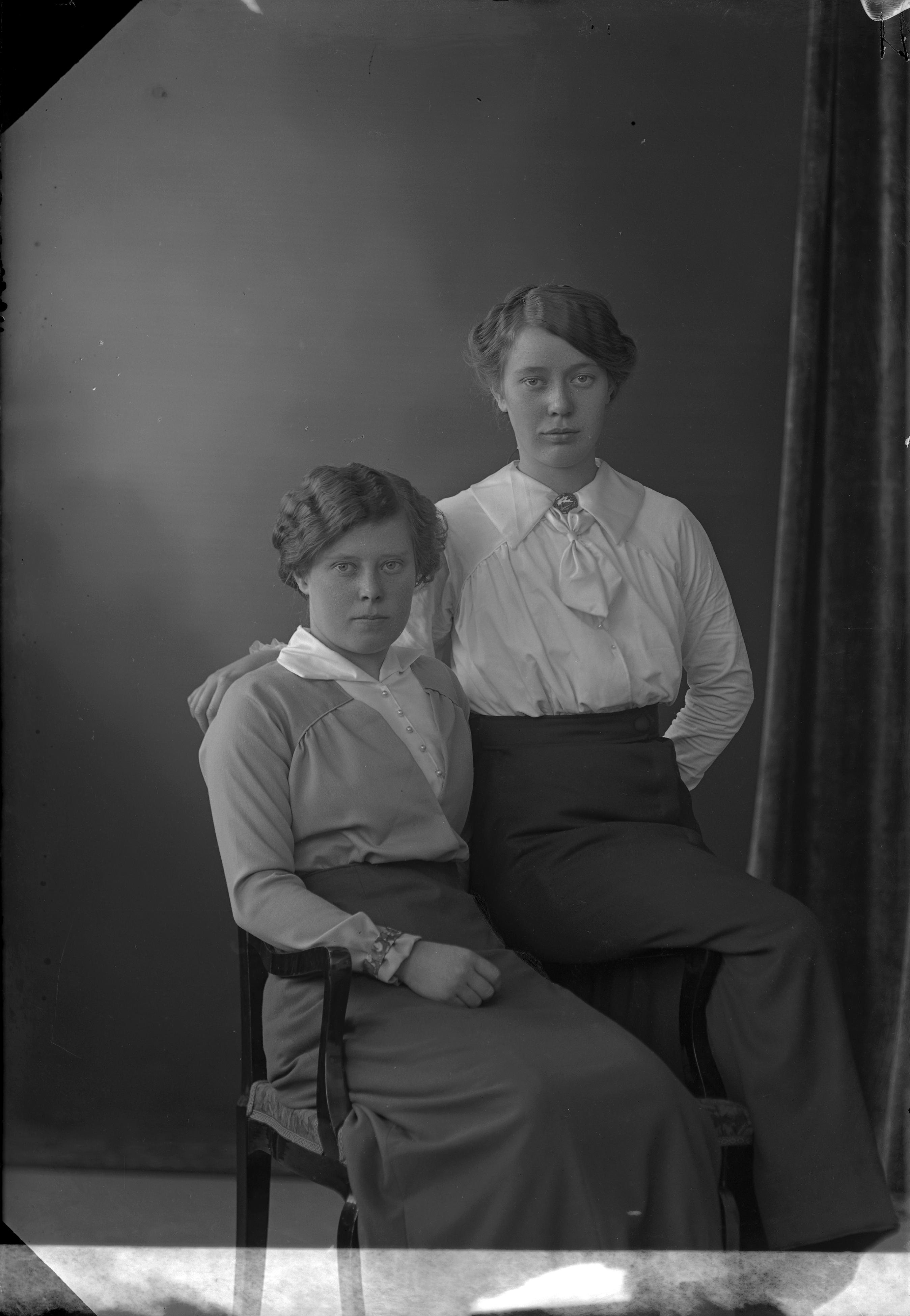 Porträtt i helfigur av Maria Nilsson i sällskap med okänd kvinna. Den ena sitter i stol, den andra på dess armstöd.