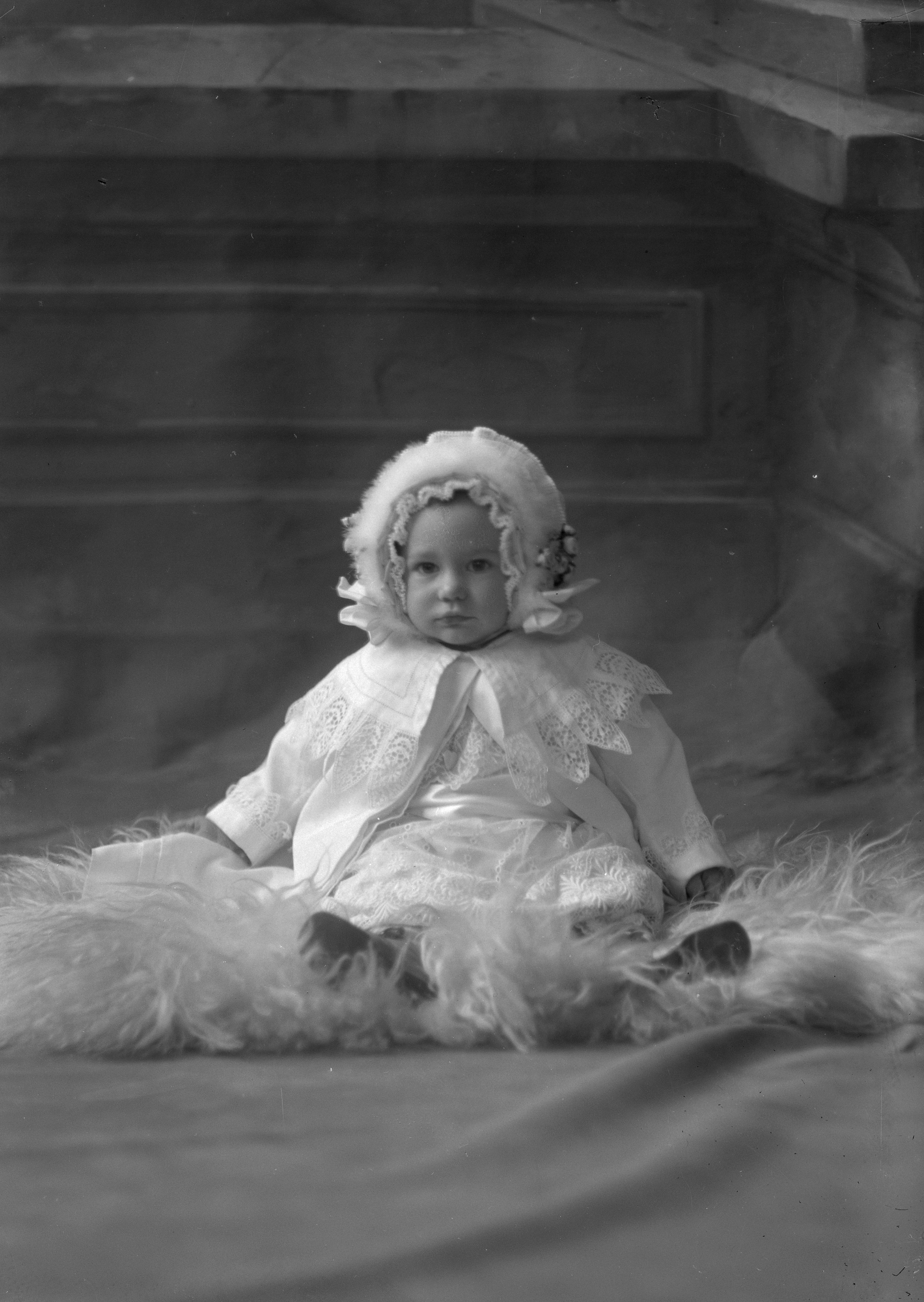 Porträtt i helfigur av fru Anderssons son, iklädd mössa, sittande på fäll.