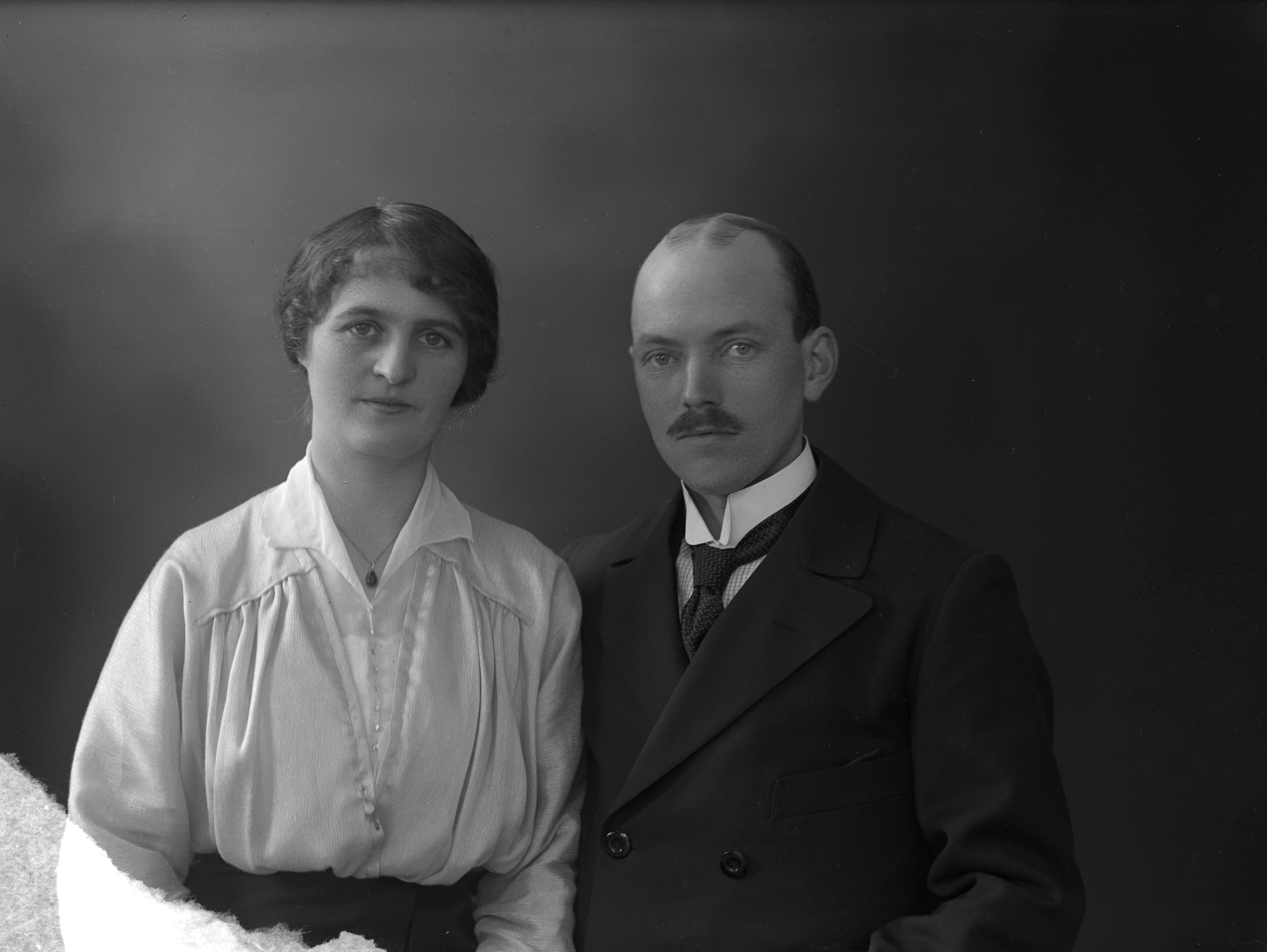 Beskrivning: Porträtt i halvfigur av Gustaf Håkansson med fru.