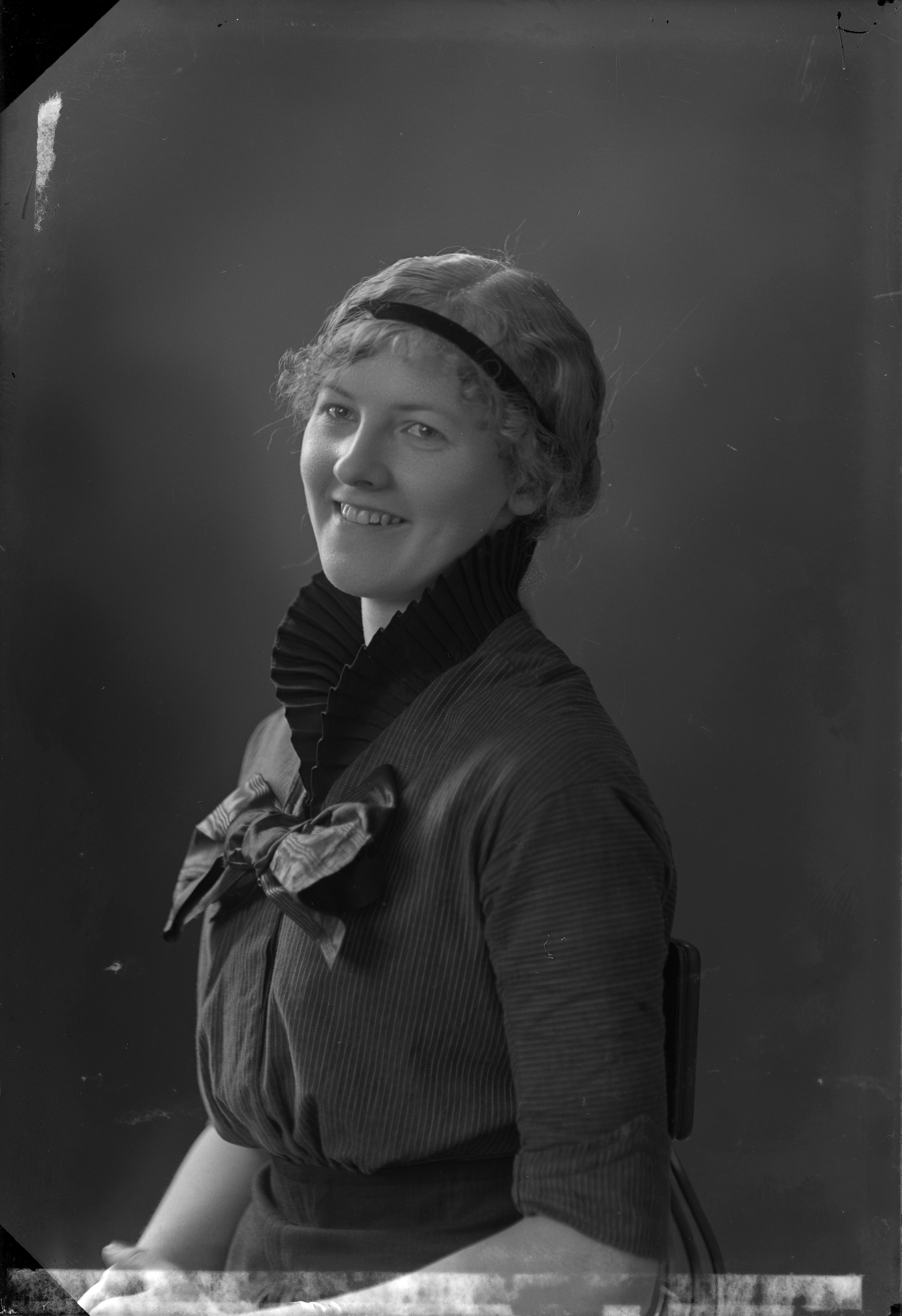 Beskrivning: Porträtt i halvfigur av Agnes Johnsson i hårband.