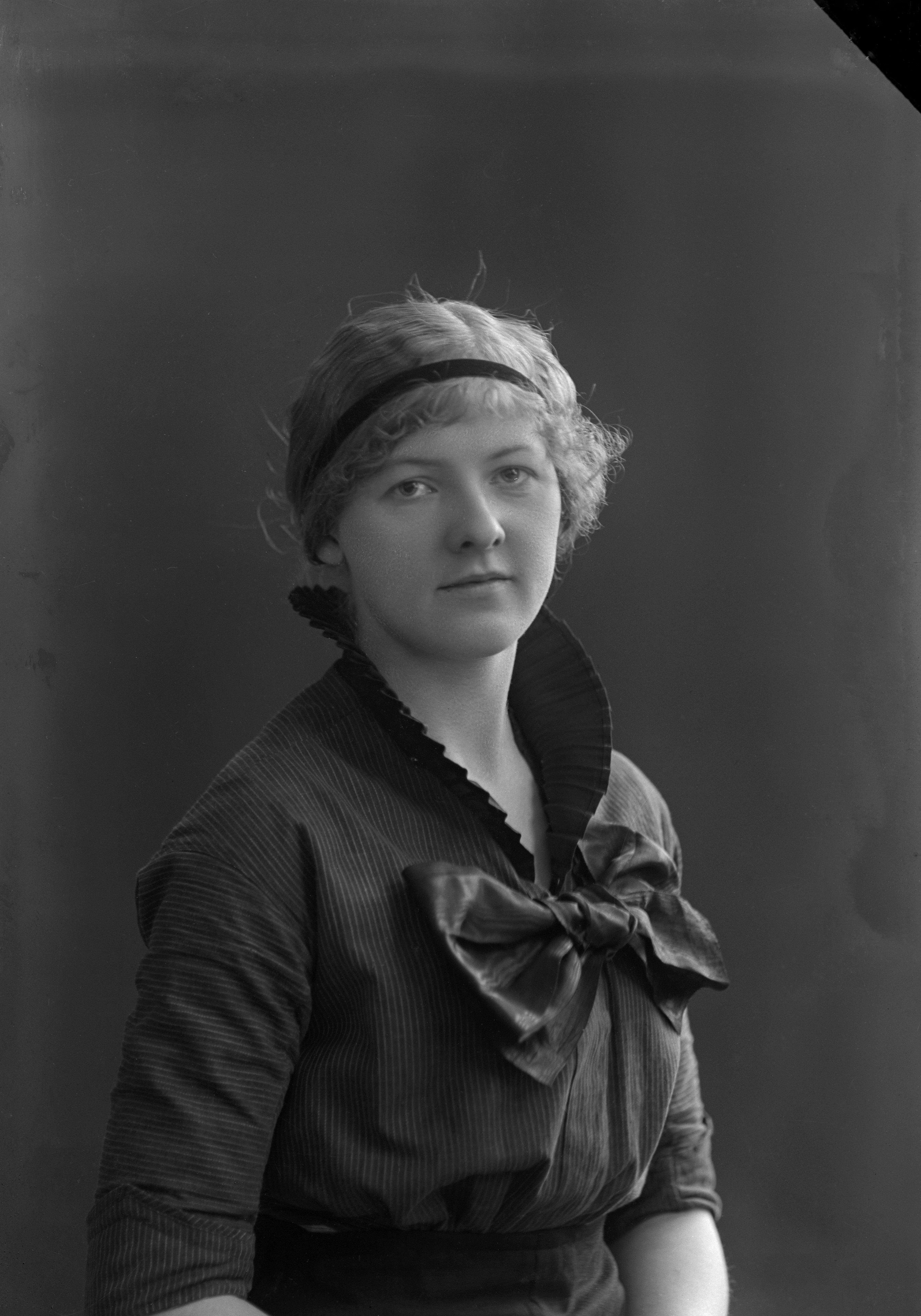 Beskrivning: Porträtt i halvfigur av Agnes Johnsson i hårband.
