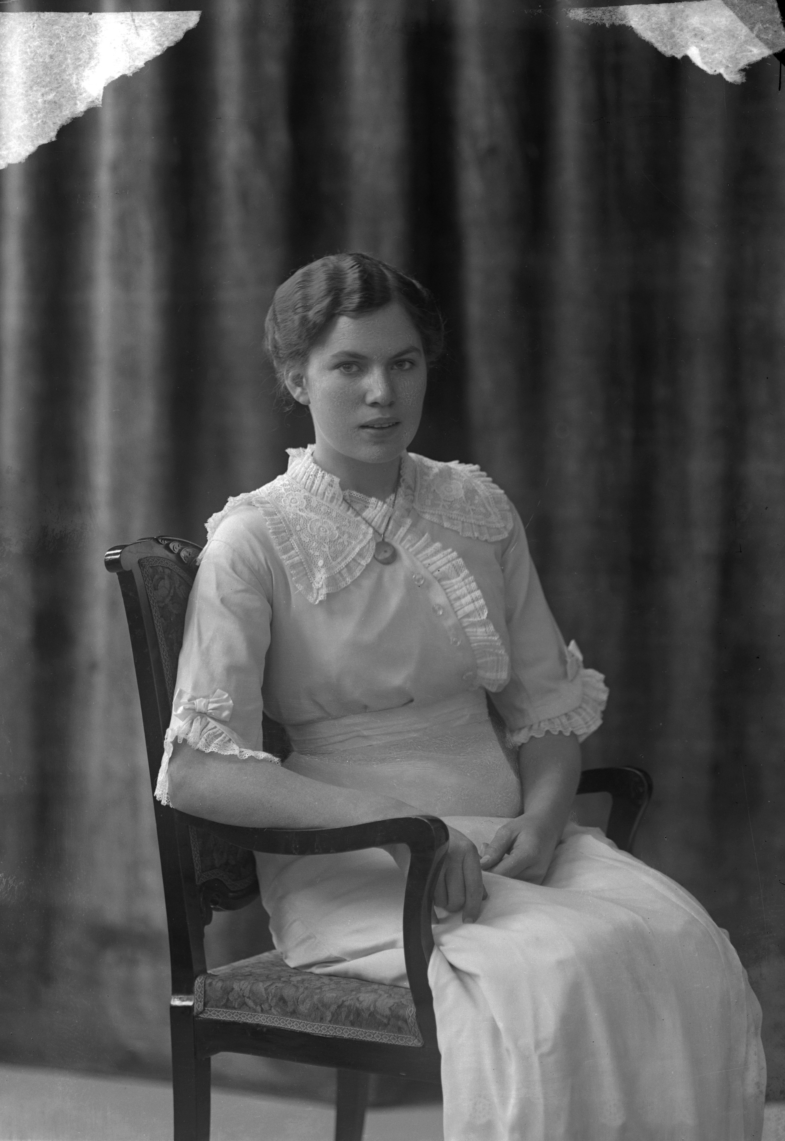 Porträtt i helfigur av Lydia Gustafsson, sittande i stol.