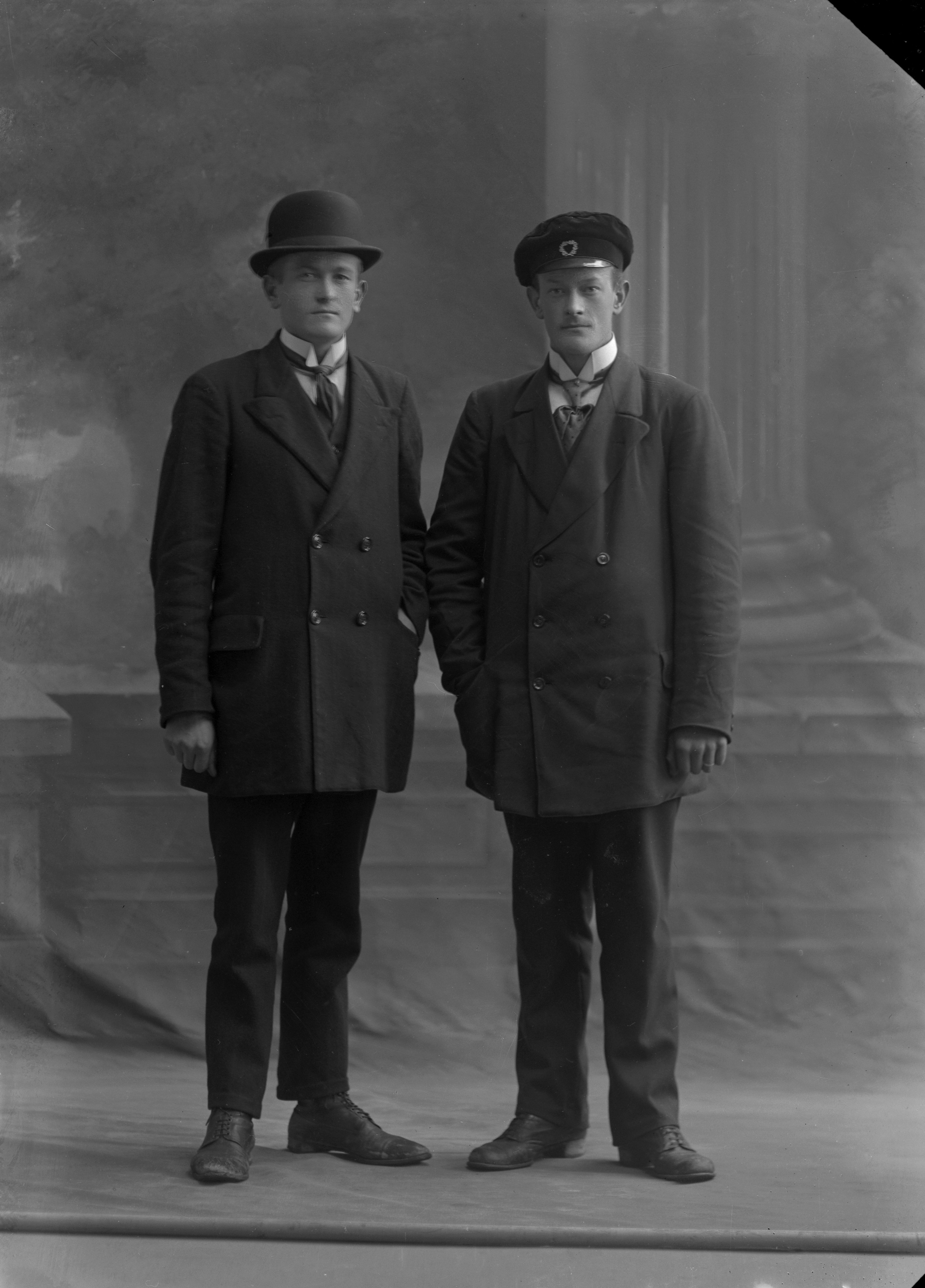 Porträtt i helfigur av K. Henriksson med okänd man, båda iklädda hattar och ytterrockar. Ateléjfond med pelare utgör bakgrunden.