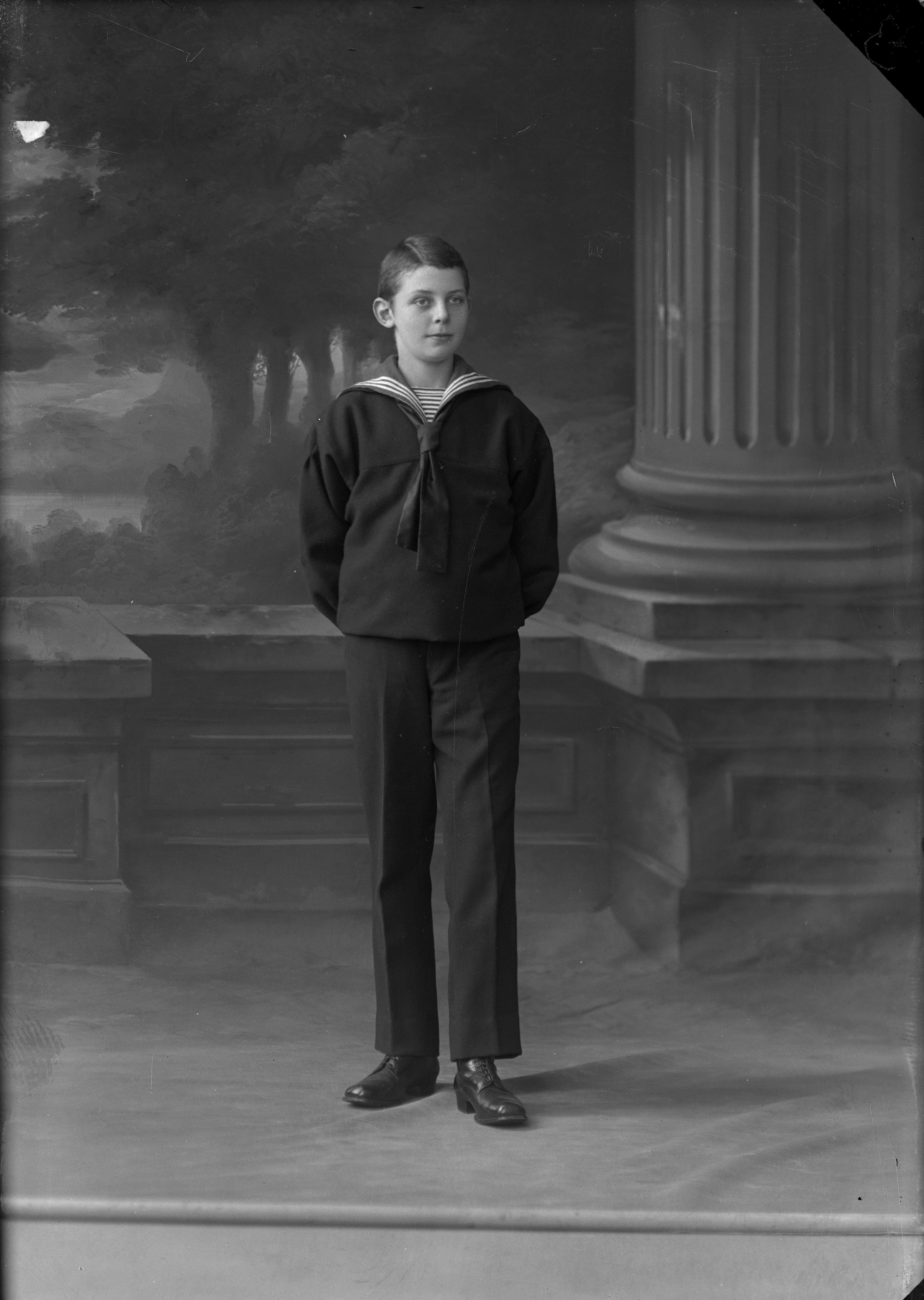 Porträtt i helfigur av Herman Hernow iklädd sjömanskostym. Ateljéfond med romersk pelare utgör bakgrunden.