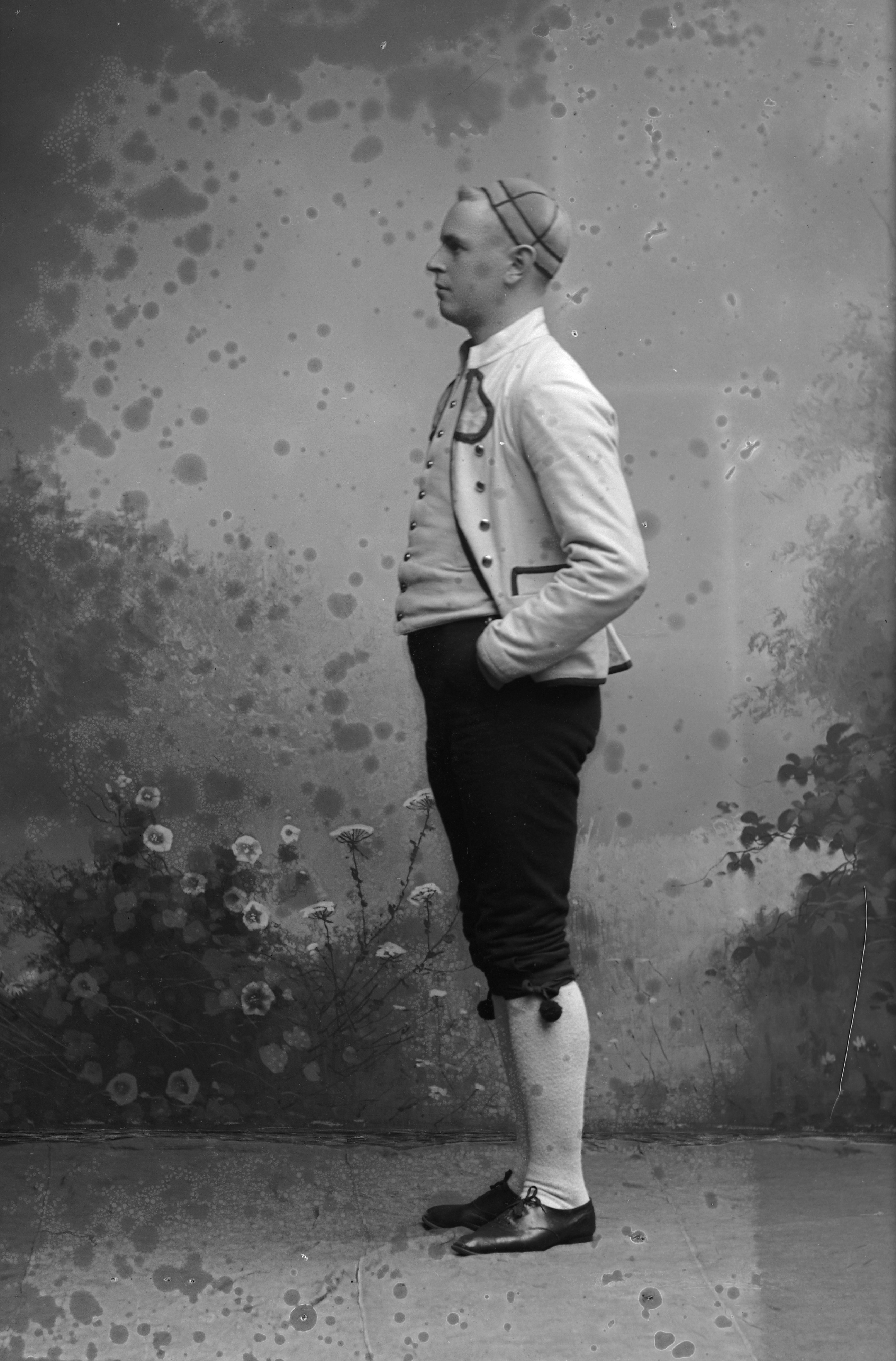 Porträtt i helfigur av man, Stamröe (?), iklädd mössa och yrkesuniform av okänt slag.