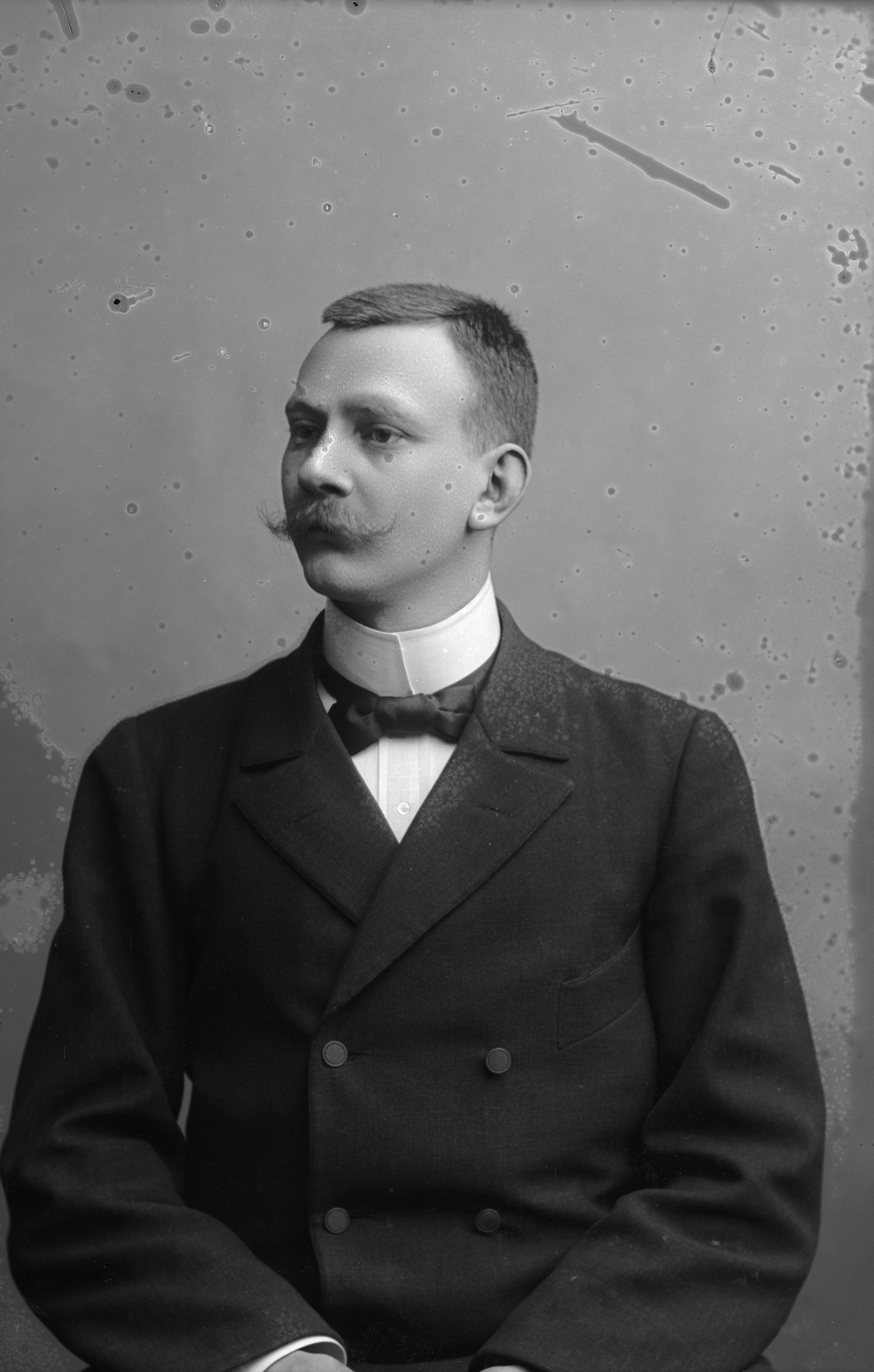 Beskrivning: Porträtt i halvfigur av skräddaren och klädhandlaren Edvin Nyblom.