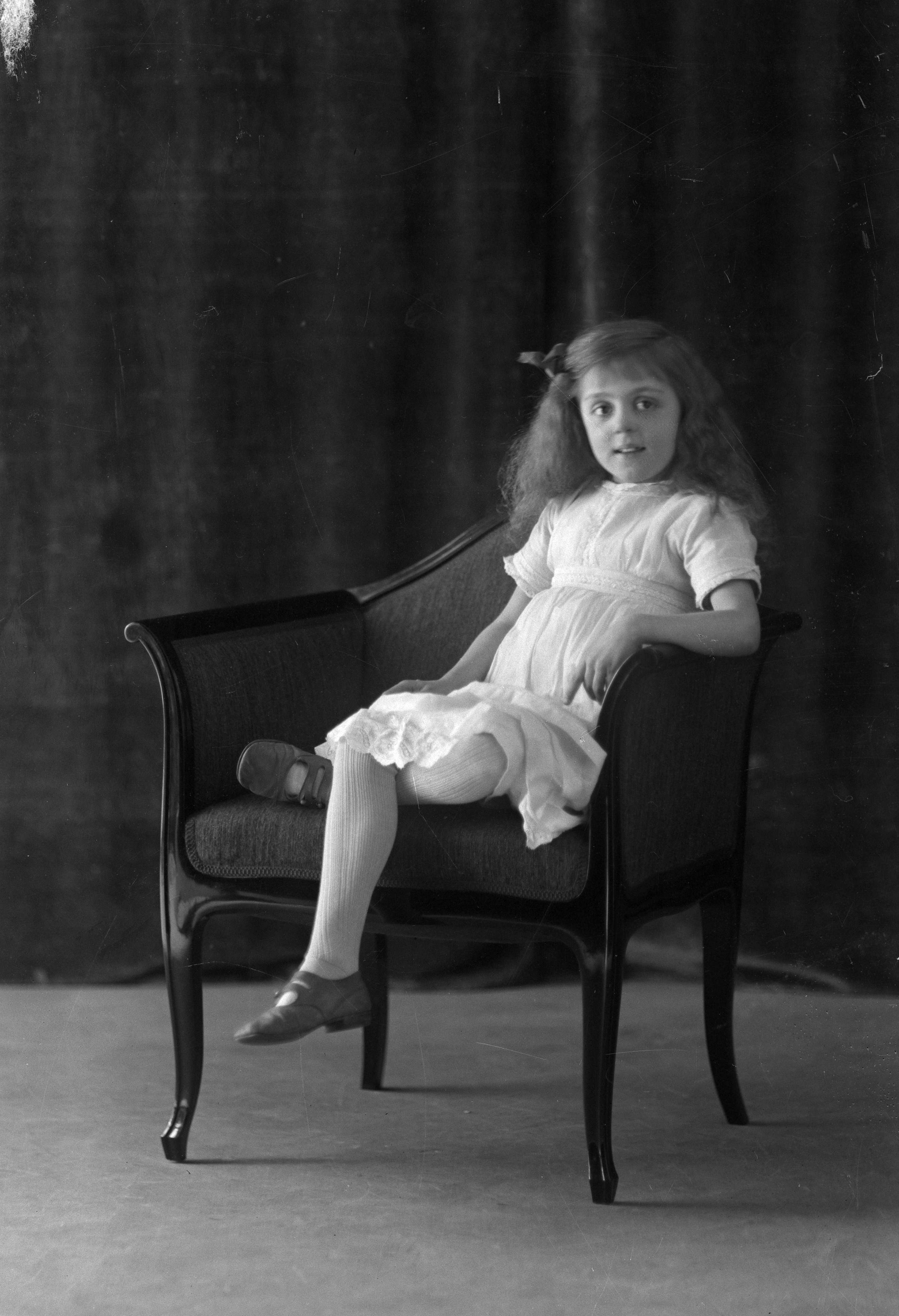 Porträtt i helfigur av Rut Boström, sittande i stol.