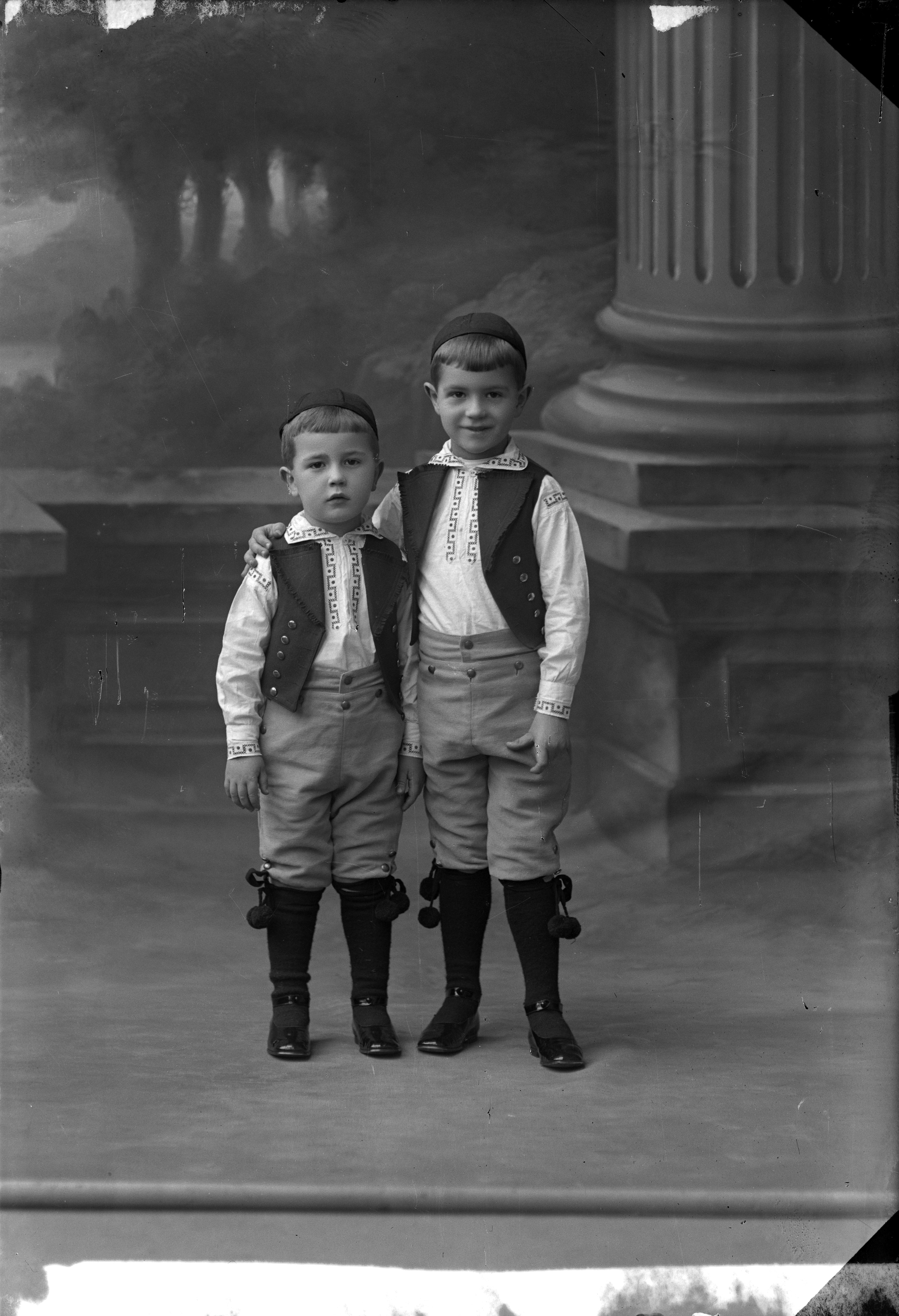 Porträtt i helfigur av ingejör Sjöbergs söner, iklädda mössor och västar. Ateljéfond med pelarmotiv och parkmiljö utgör bakgrunden.