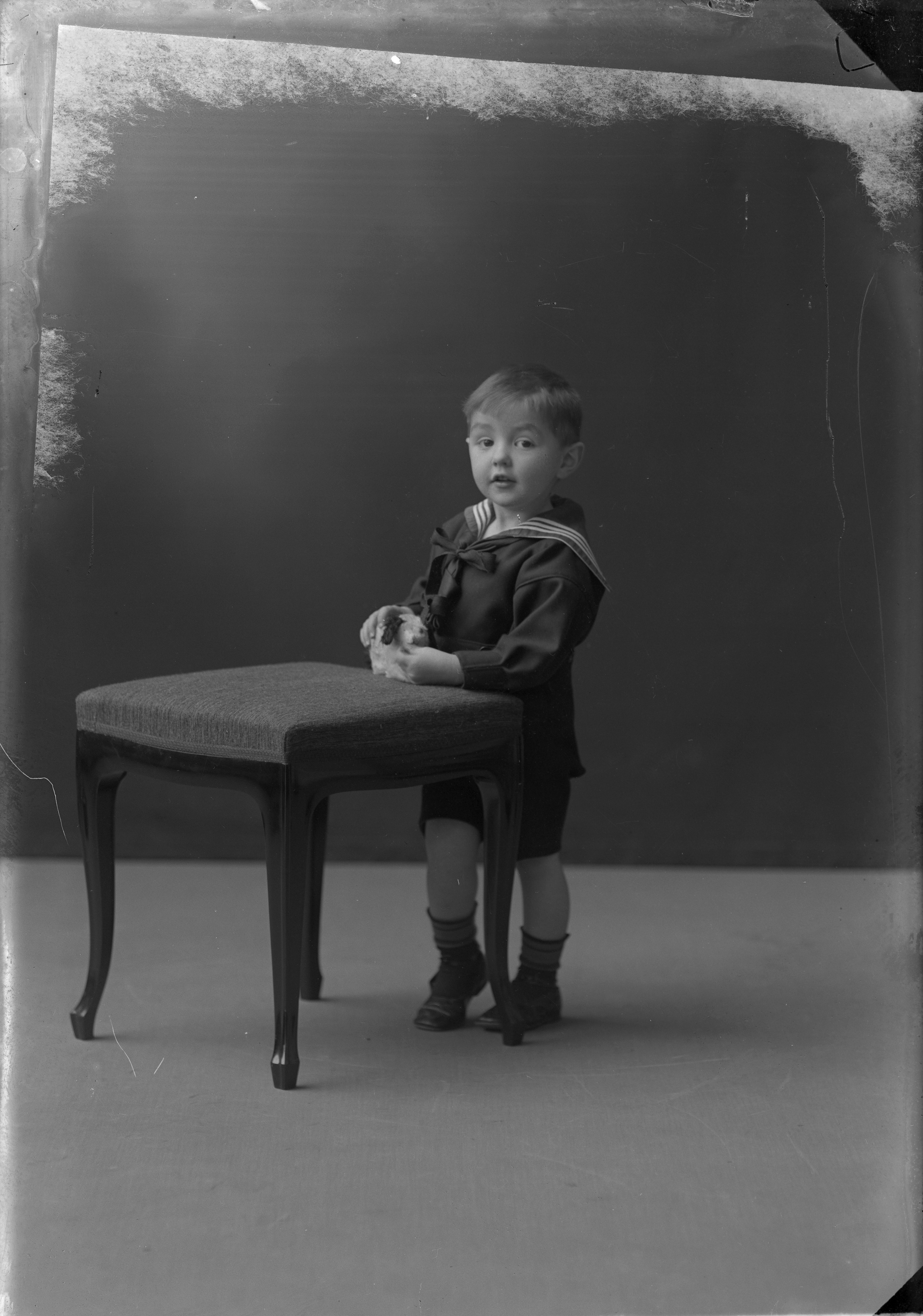 Porträtt i helfigur av Börje Thulin, iklädd sjömanskostym, stående vid taburett.