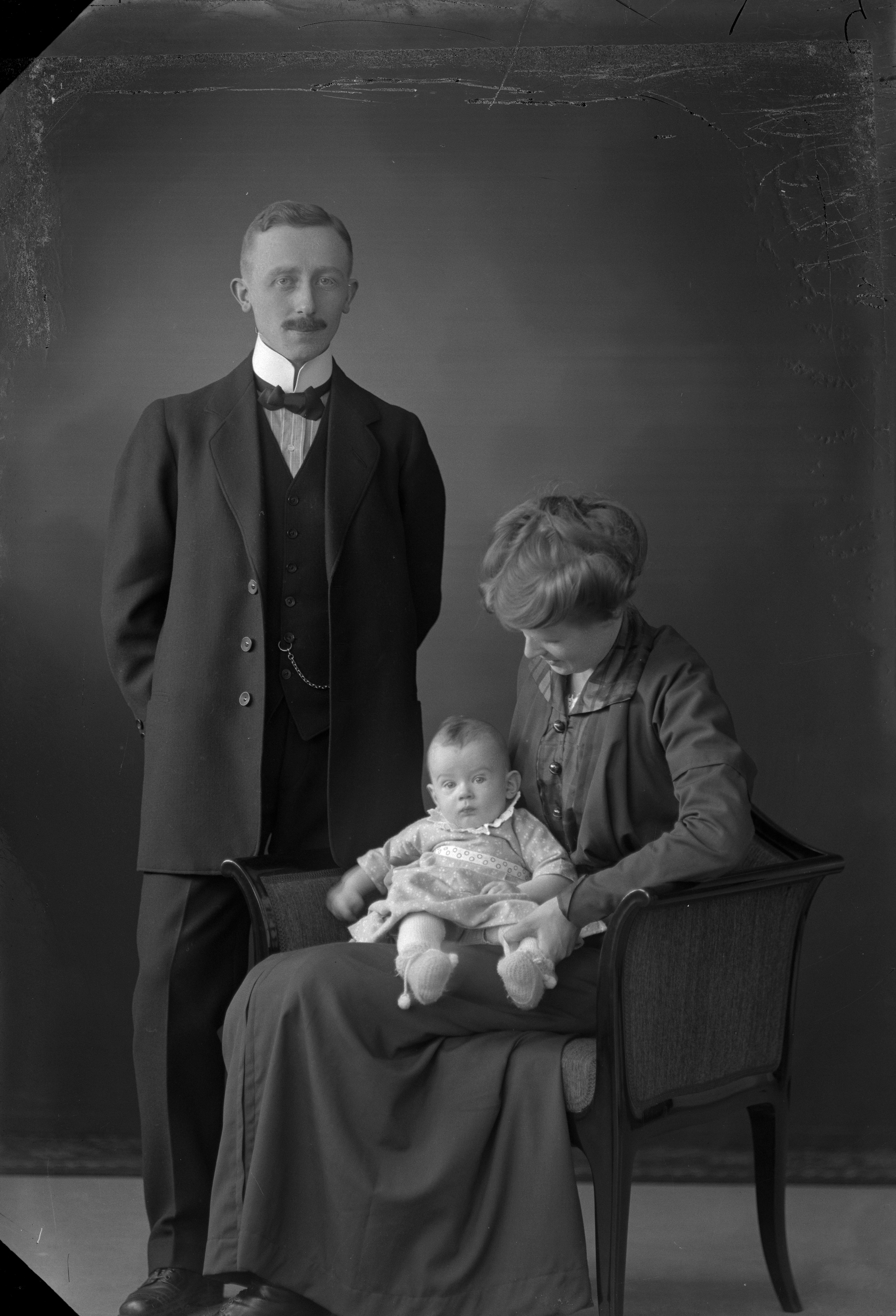 Beskrivning: Porträtt i helfigur av bankmannen G. Lindell med familj.