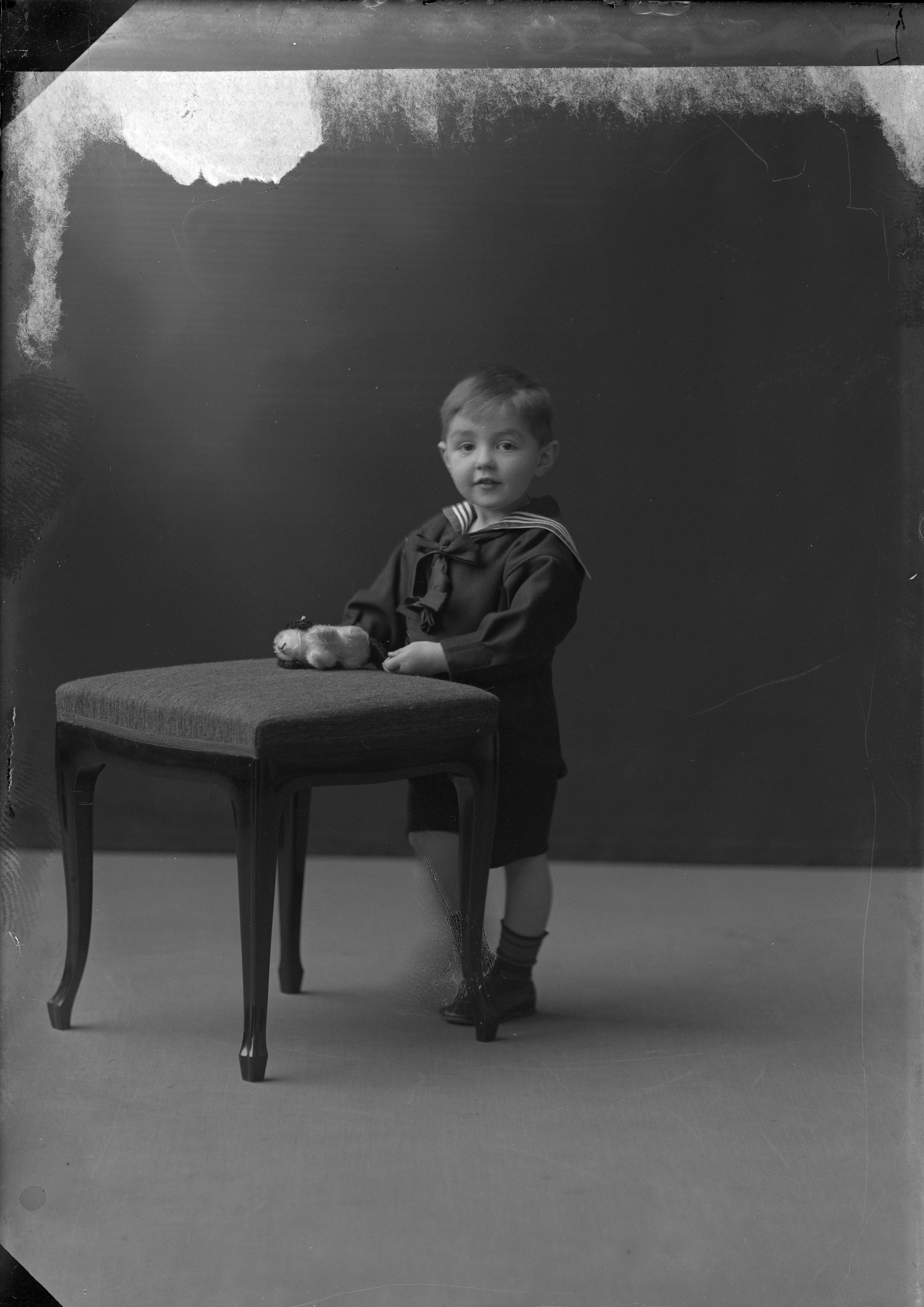 Porträtt i helfigur av Börje Thulin, iklädd sjömanskostym, stående vid taburett.