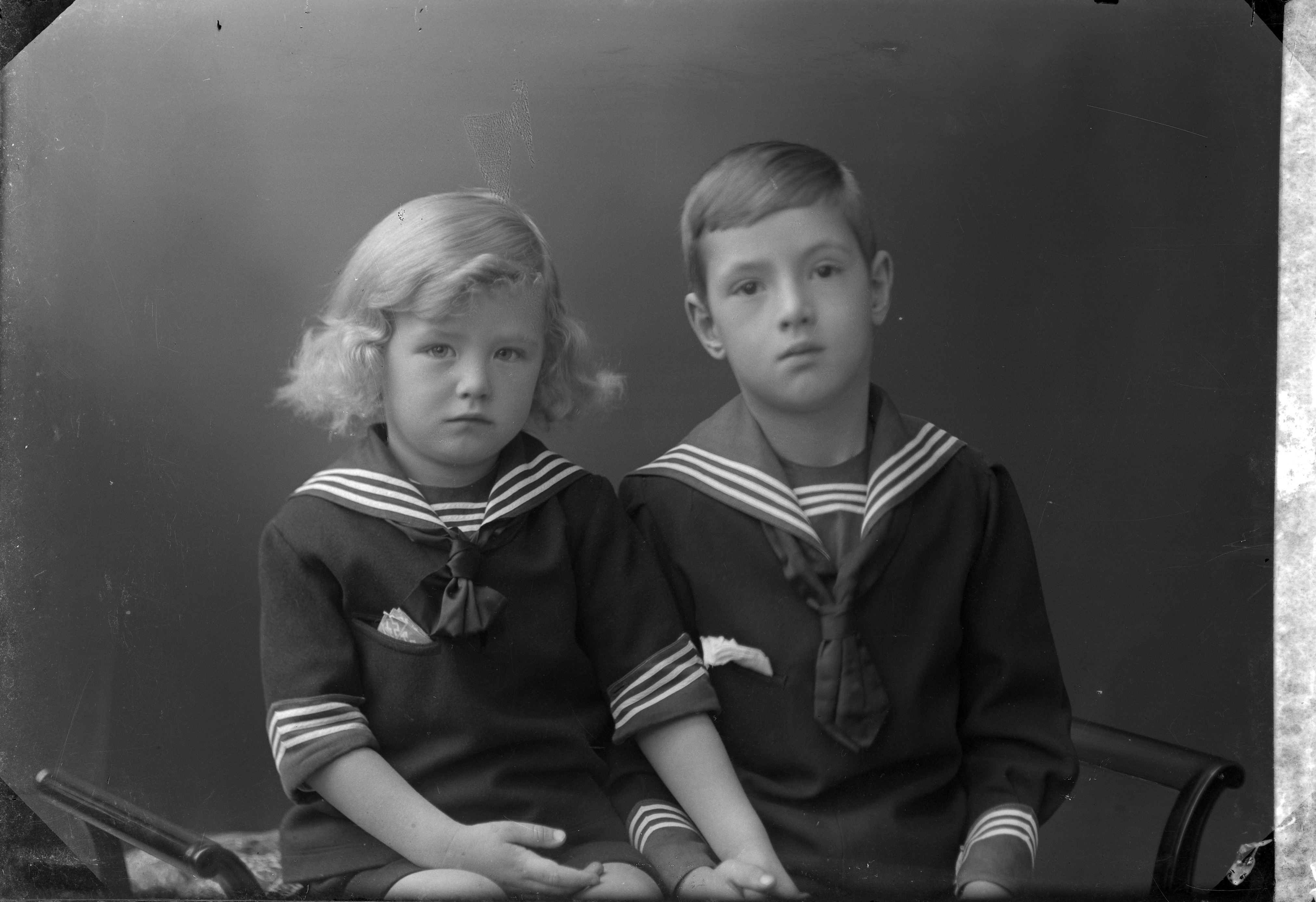 Porträtt i halvfigur av fru Eriksson son och dotter, iklädda sjömanskostymer.