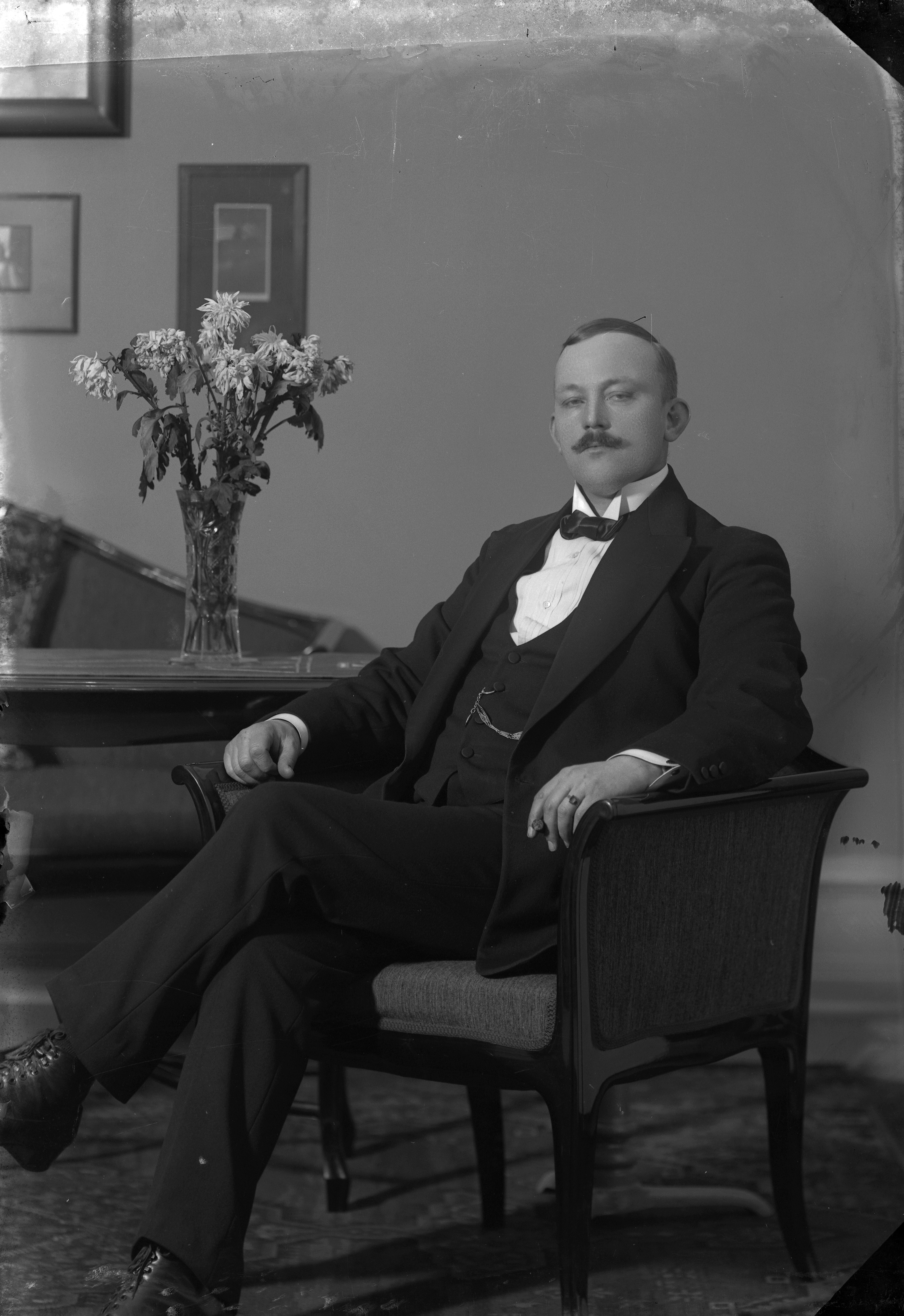 Porträtt i helfigur av handelsmannen Carl August Lång, sittande i stol, i rumsinteriör.