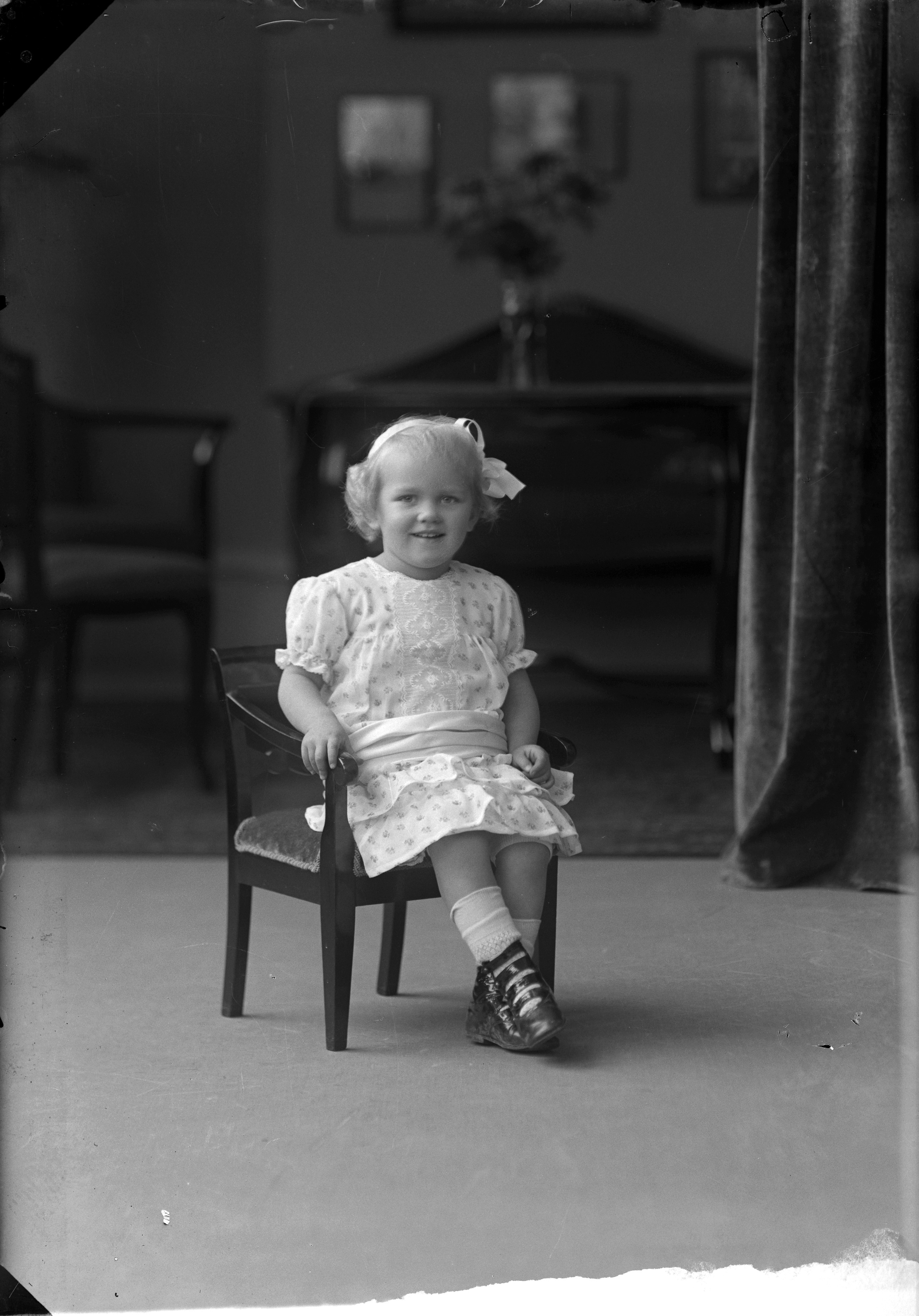 Porträtt i helfigur av Inga Nilsson, sittande på stol. Fondvägg med rumsinteriör utgör bakgrunden.