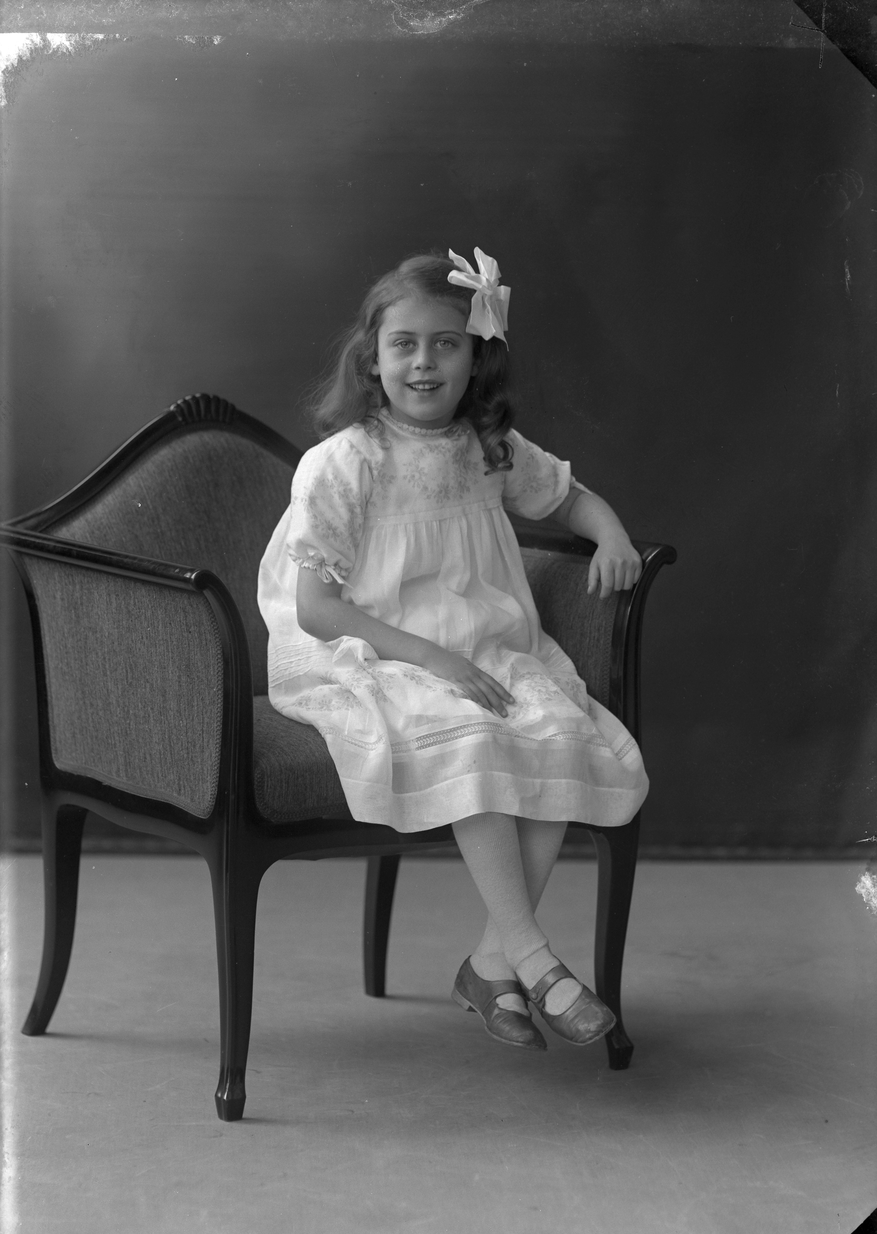 Porträtt i halvfigur av von Helands dotter, sittande i stol.