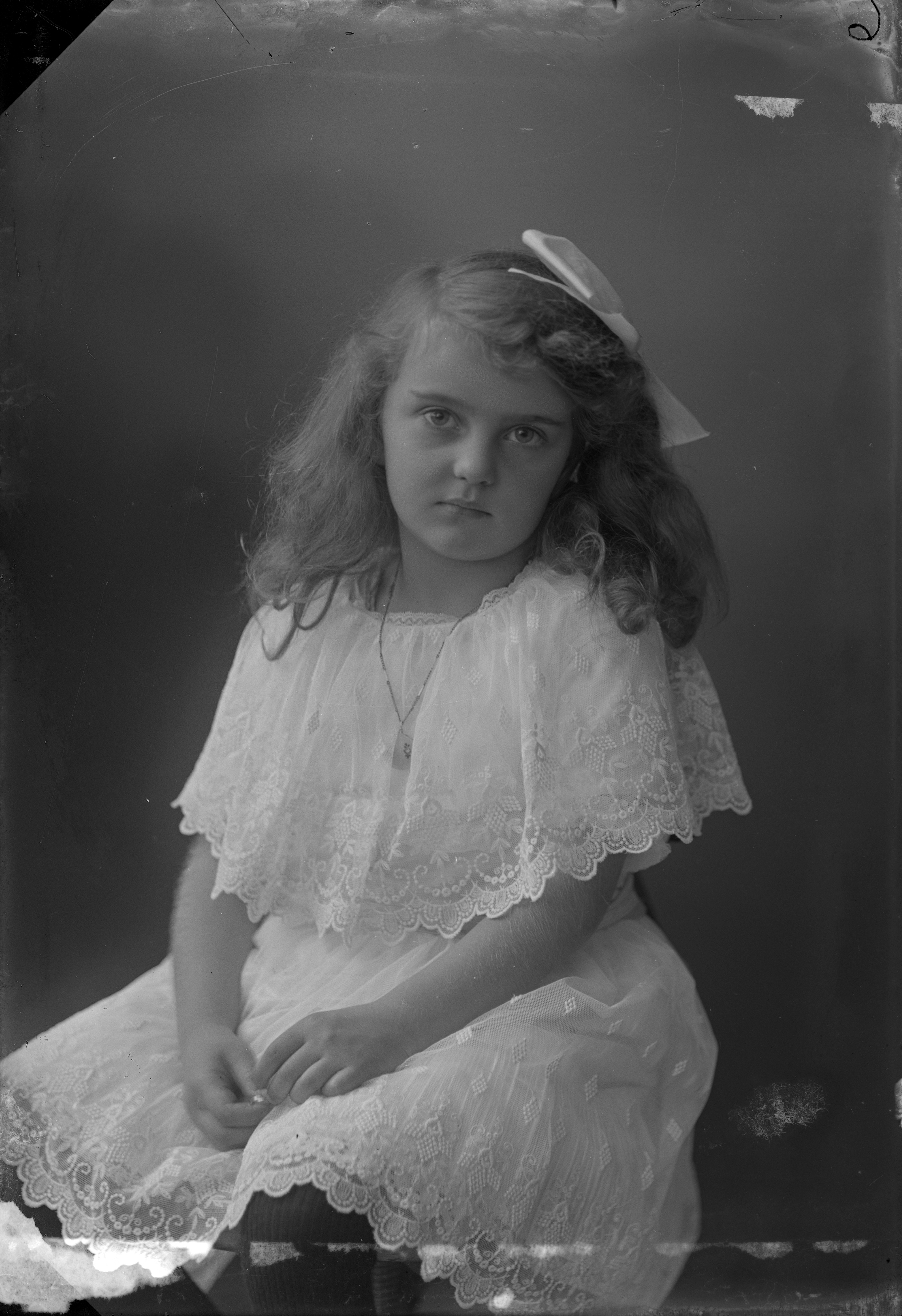 Beskrivning: Porträtt i halvfigur av Sonja Andersson med rosett i håret.
