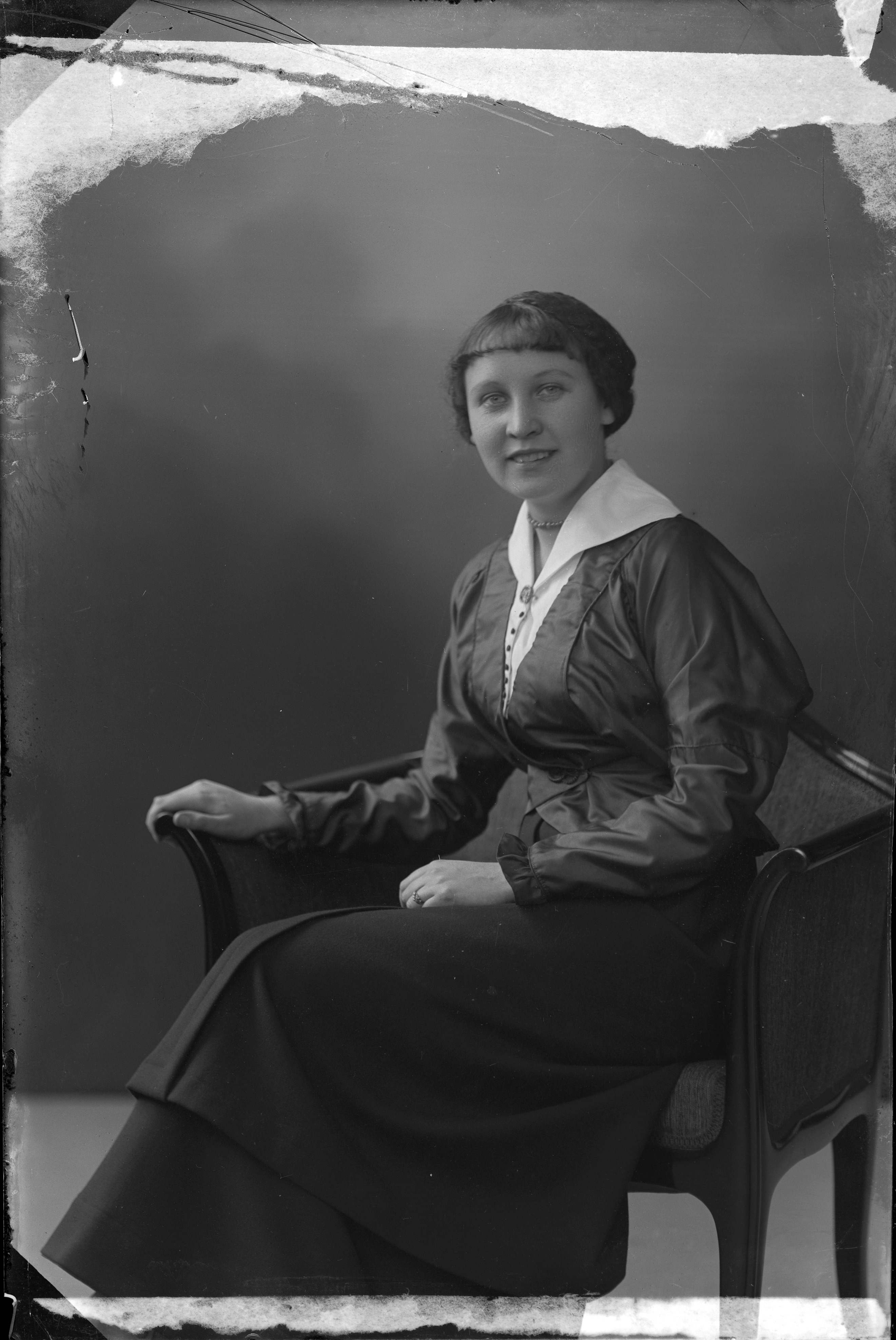 Porträtt i helfigur av Ida Olsson, sittande i stol.
