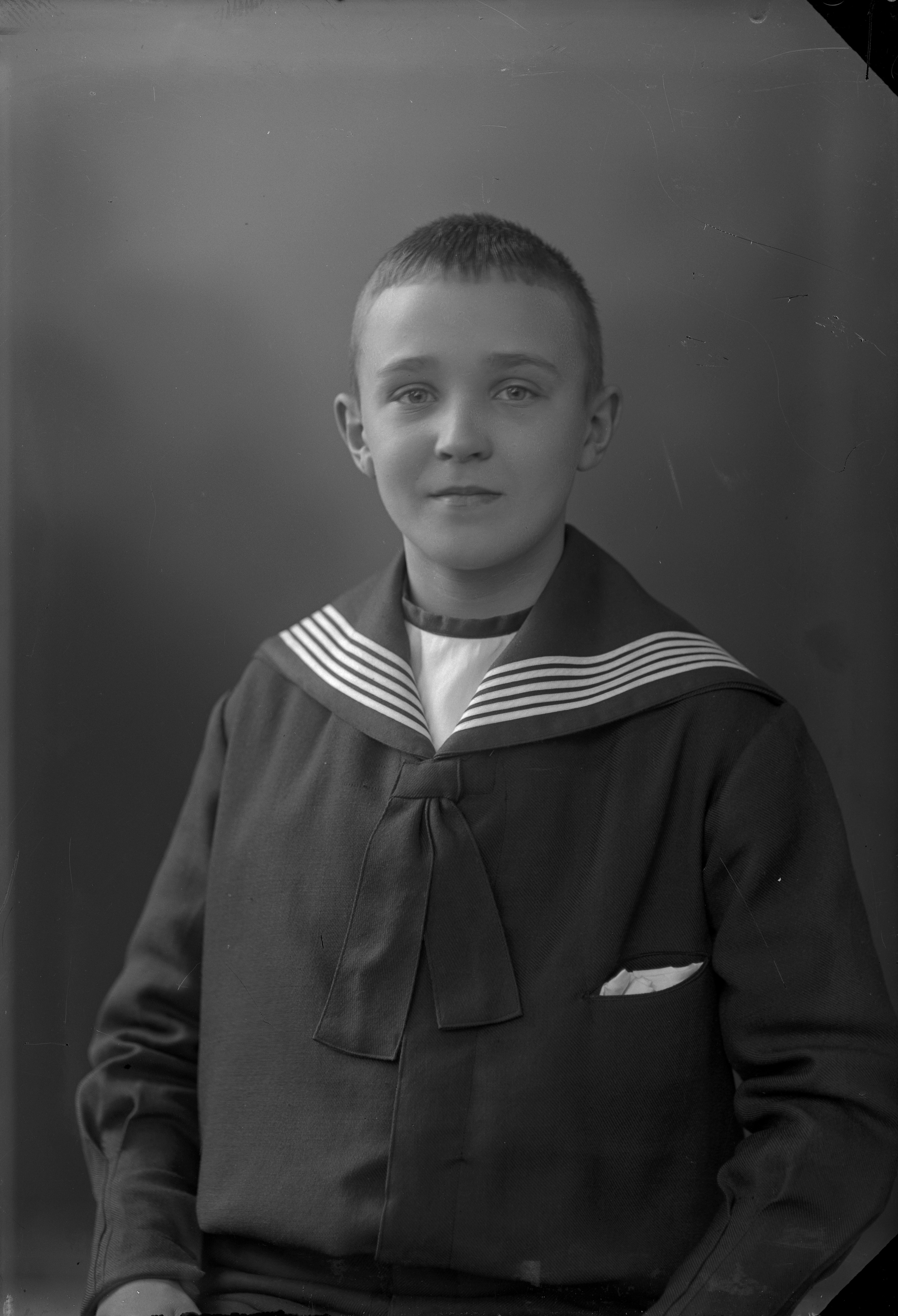 Beskrivning: Porträtt i halvfigur av E. Svensson iklädd sjömanskostym.