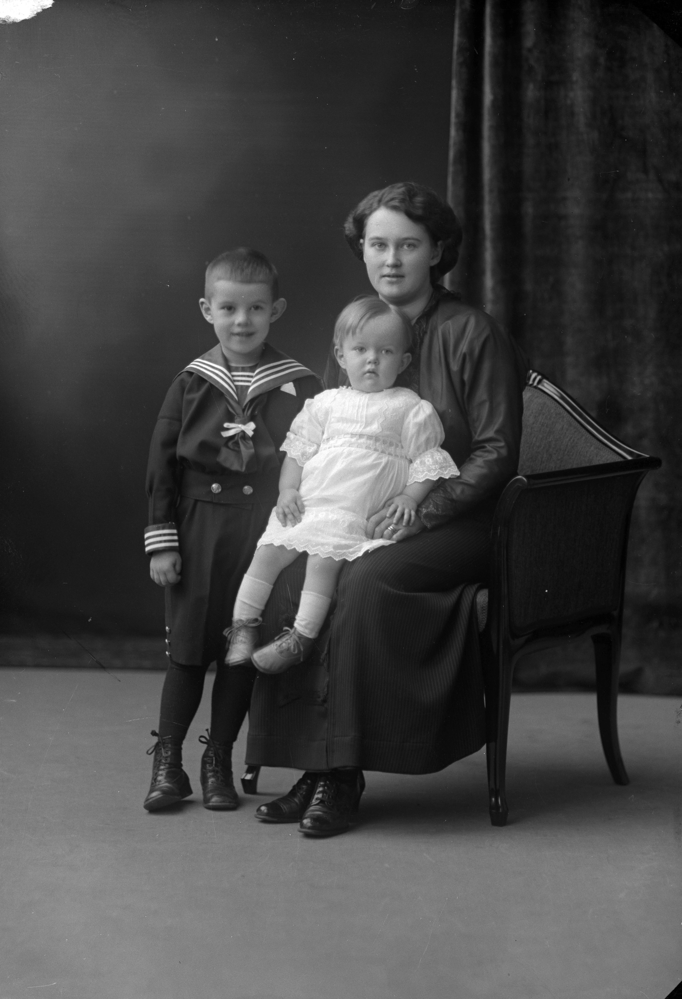 Porträtt i halvfigur Nils Rapps fru med son och dotter. Modern sittnade med dottern i knät, sonen iklädd sjömanskostym.
