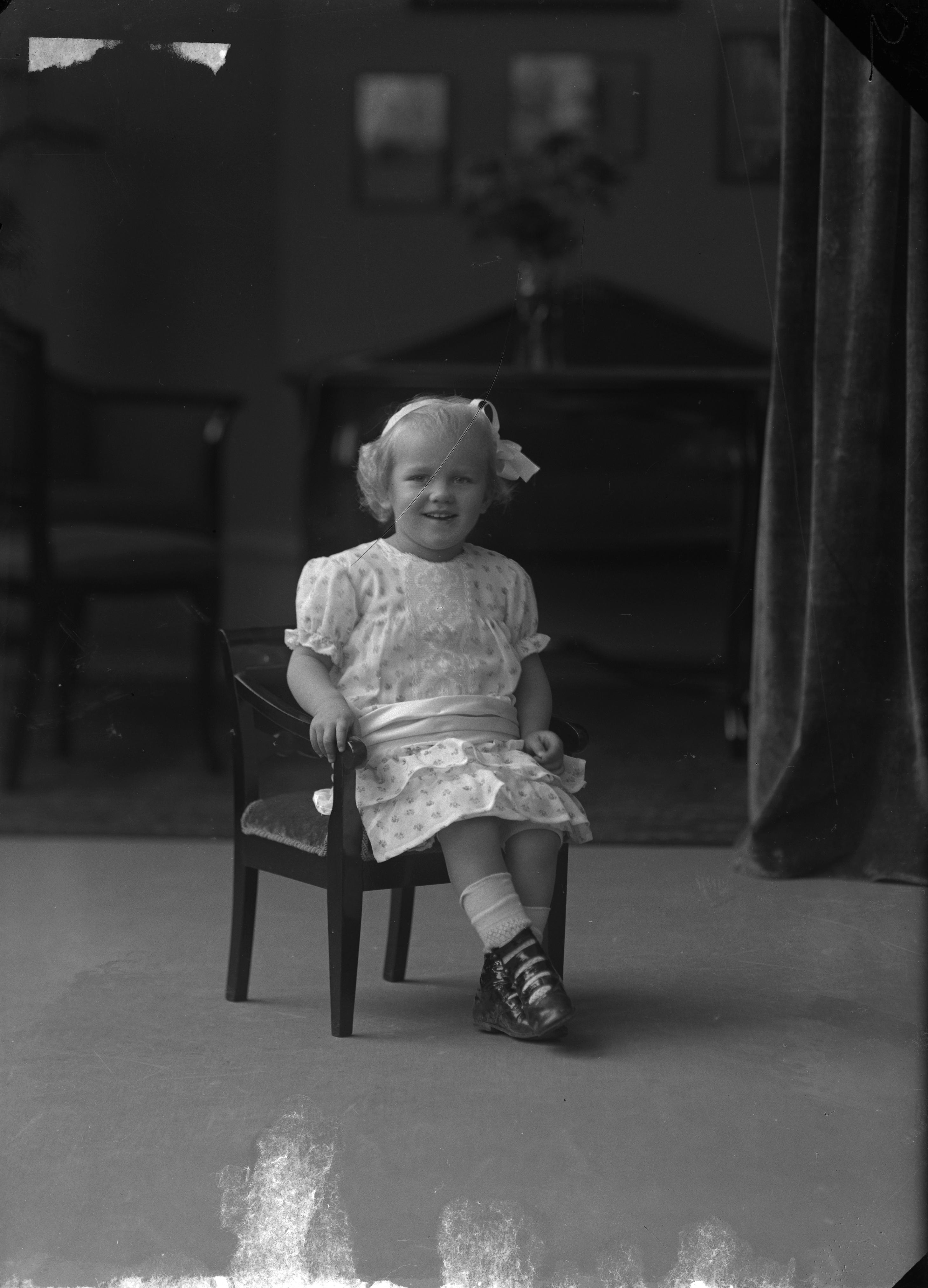 Porträtt i helfigur av Inga Nilsson, sittande på stol. Fondvägg med rumsinteriör utgör bakgrunden.