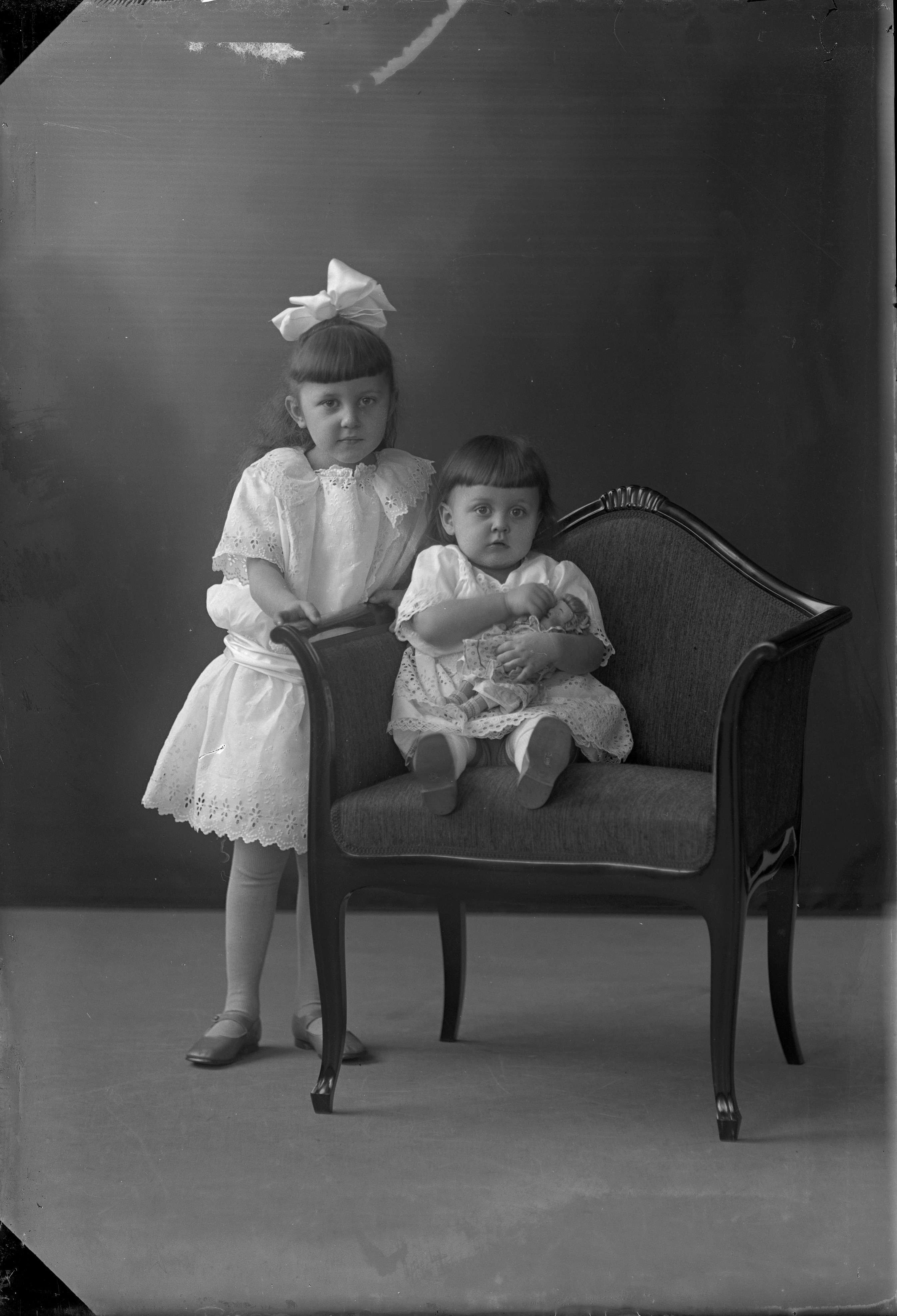 Porträtt i helfigur av Elin Hellbom med sitt syskon. Hon med rosett i håret, syskonet sittande i stol, hållande docka.