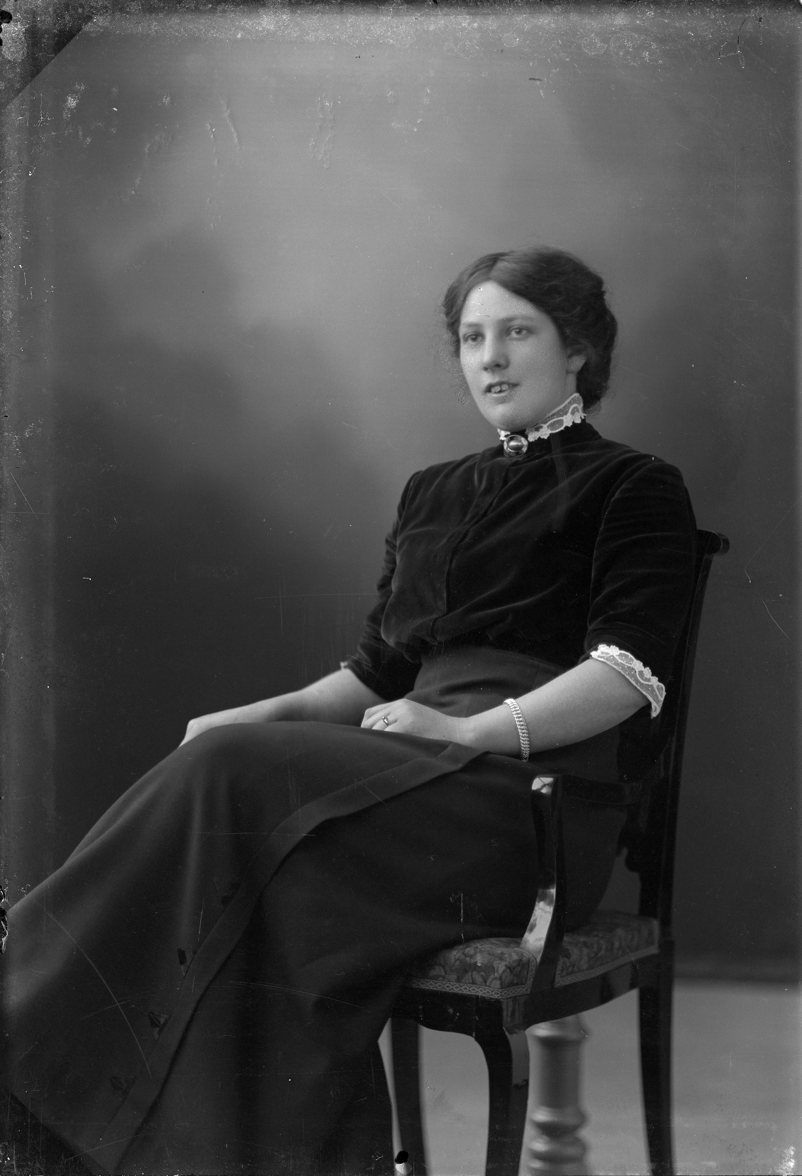 Porträtt i helfigur av Betty Rosberg, sittande i stol.