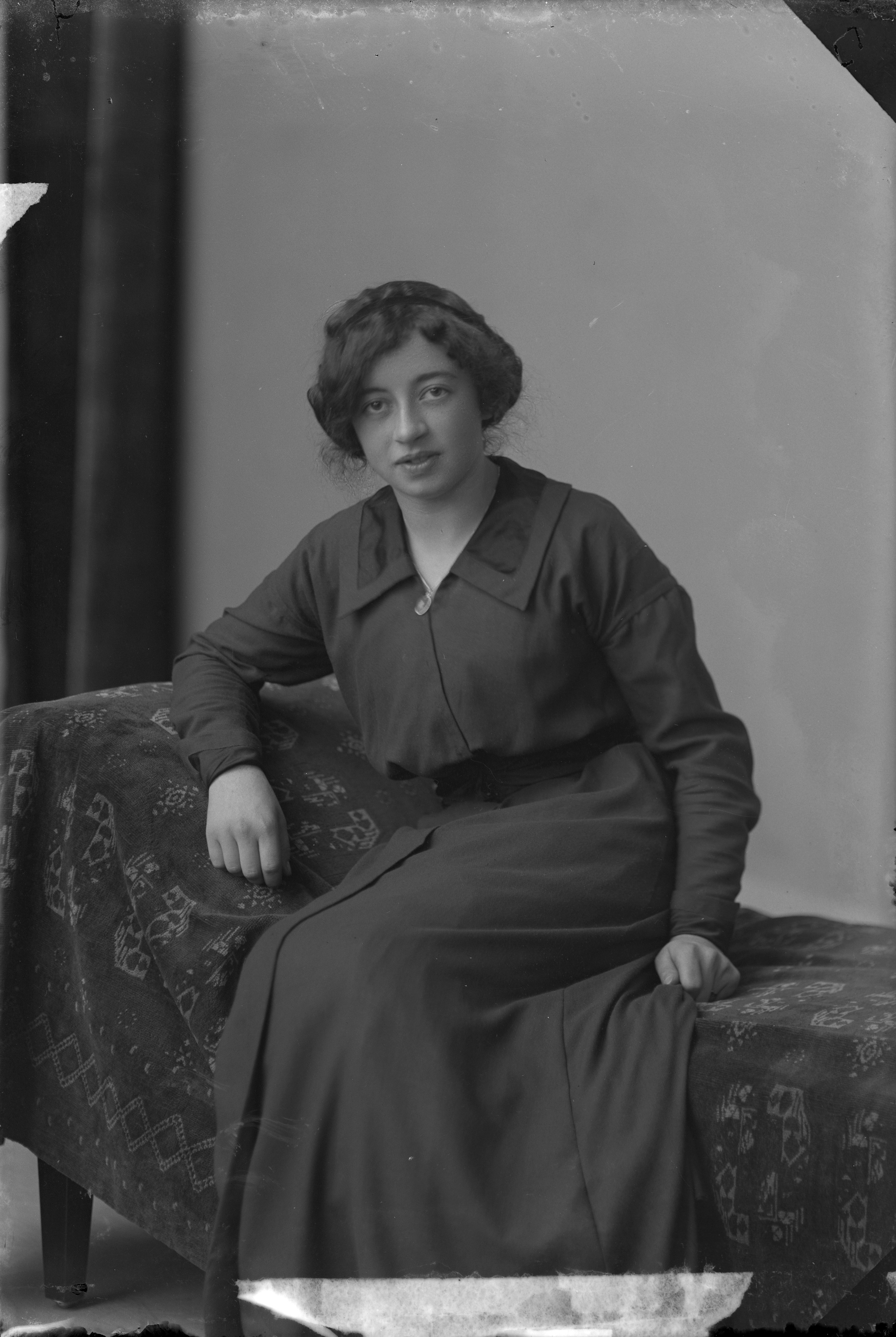 Beskrivning: Porträtt i halvfigur av fröken Helgesson sittande på säng.