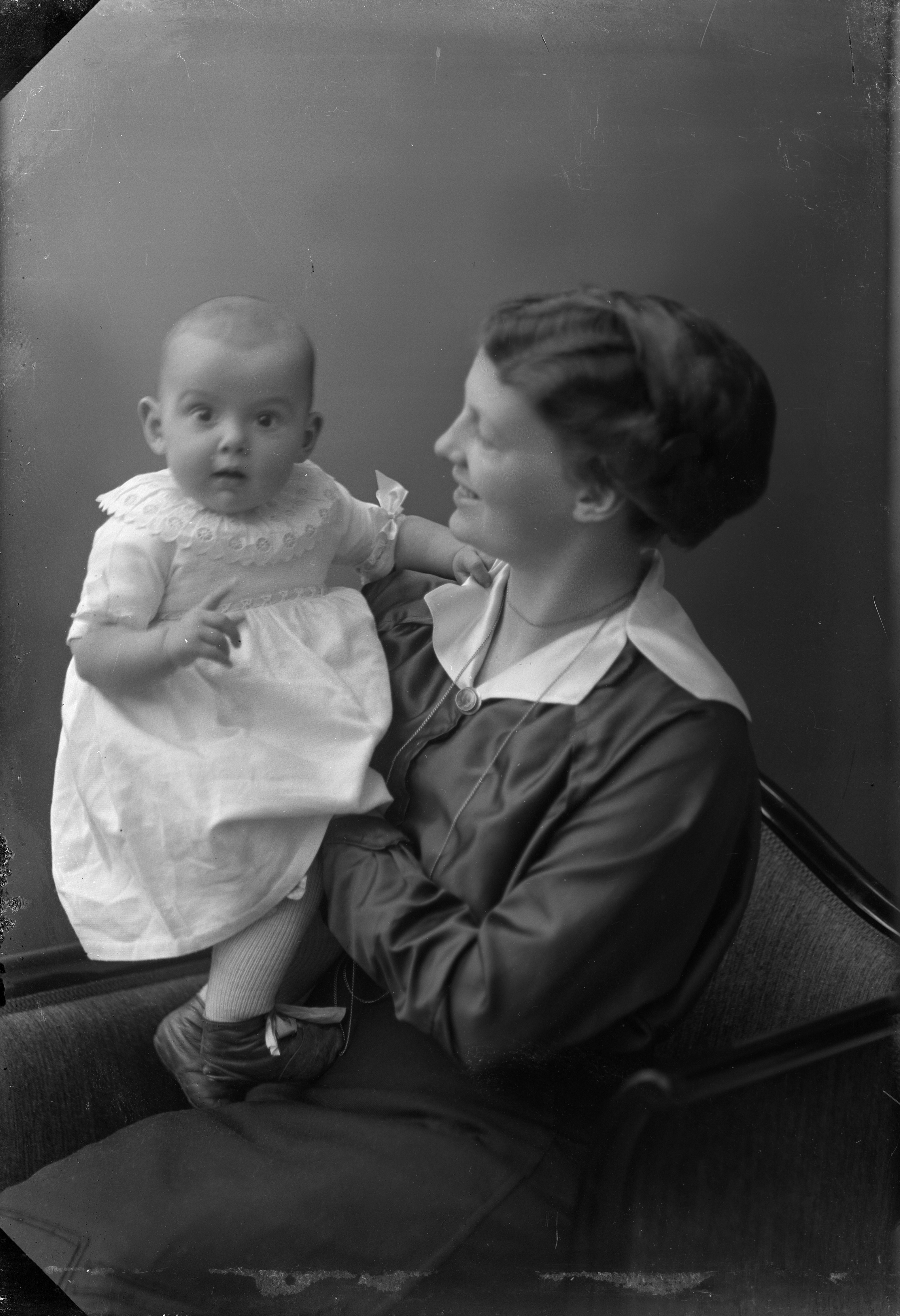 Beskrivning: Porträtt i halvfigur av fru Een hållande sitt barn i famnen.