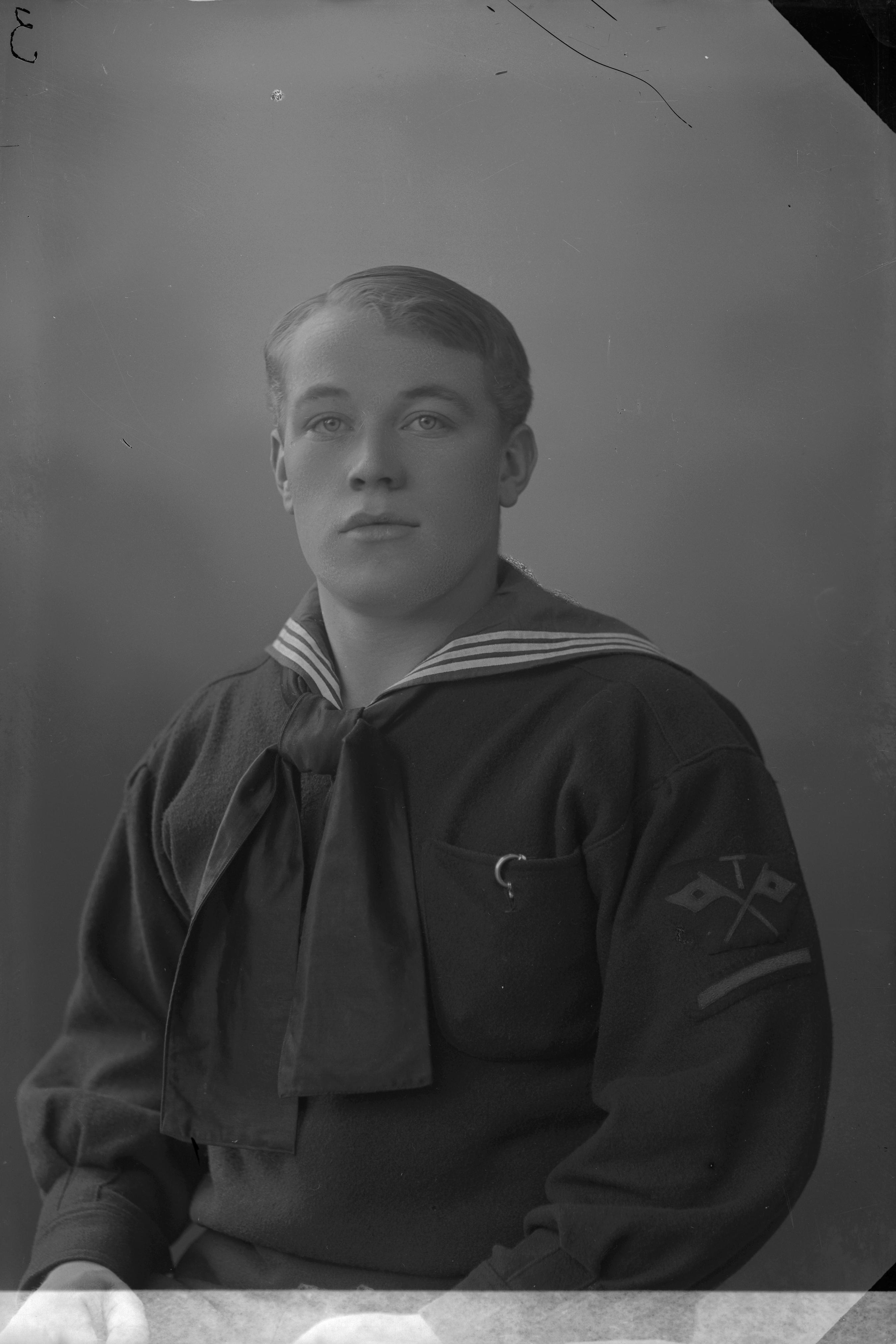 Beskrivning: Porträtt i halvfigur av sjömannen Folke Gustafsson i sjömanskostym.