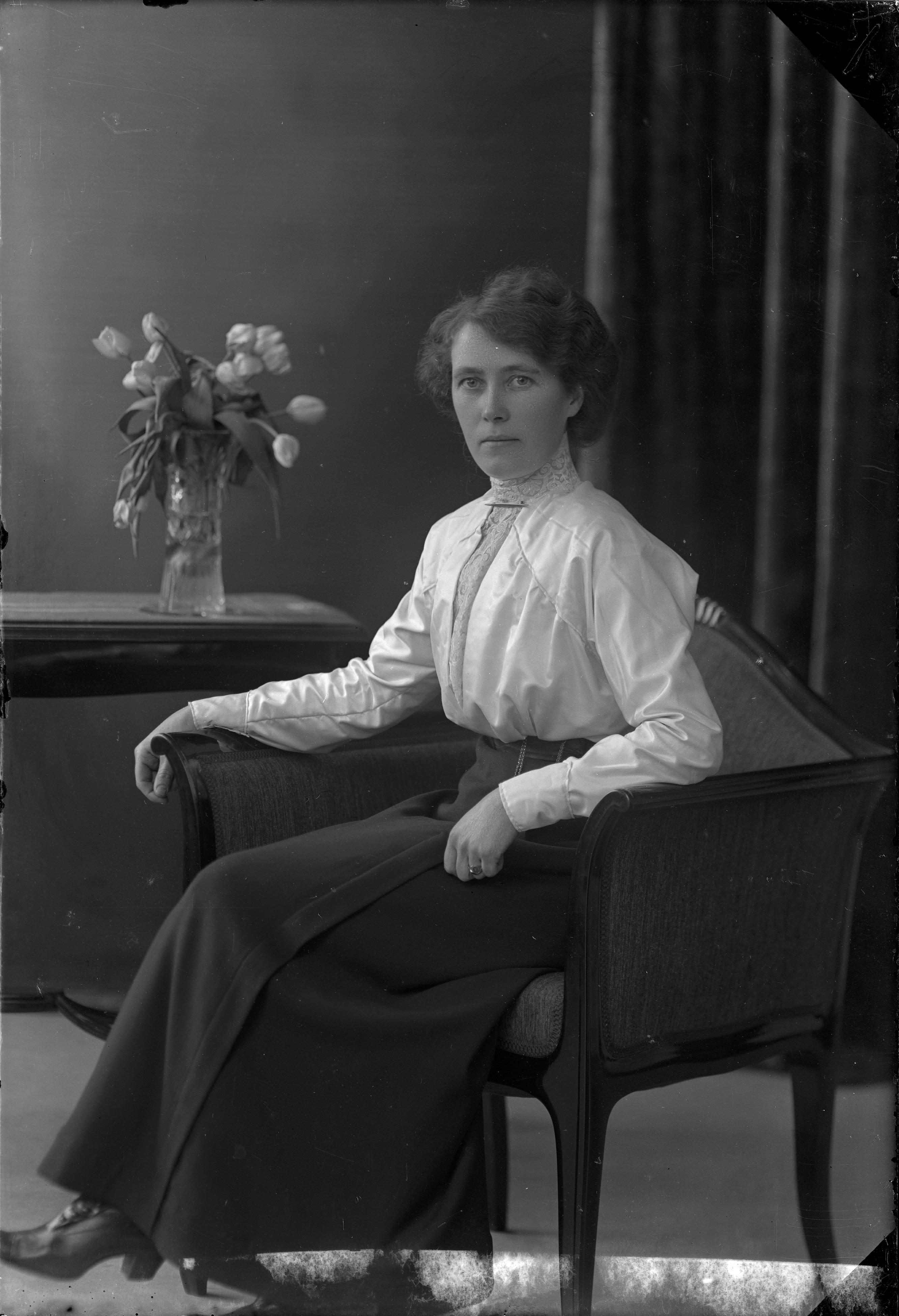 Porträtt i helfigur av Hilda Hansson, sittande i rumsinteriör.