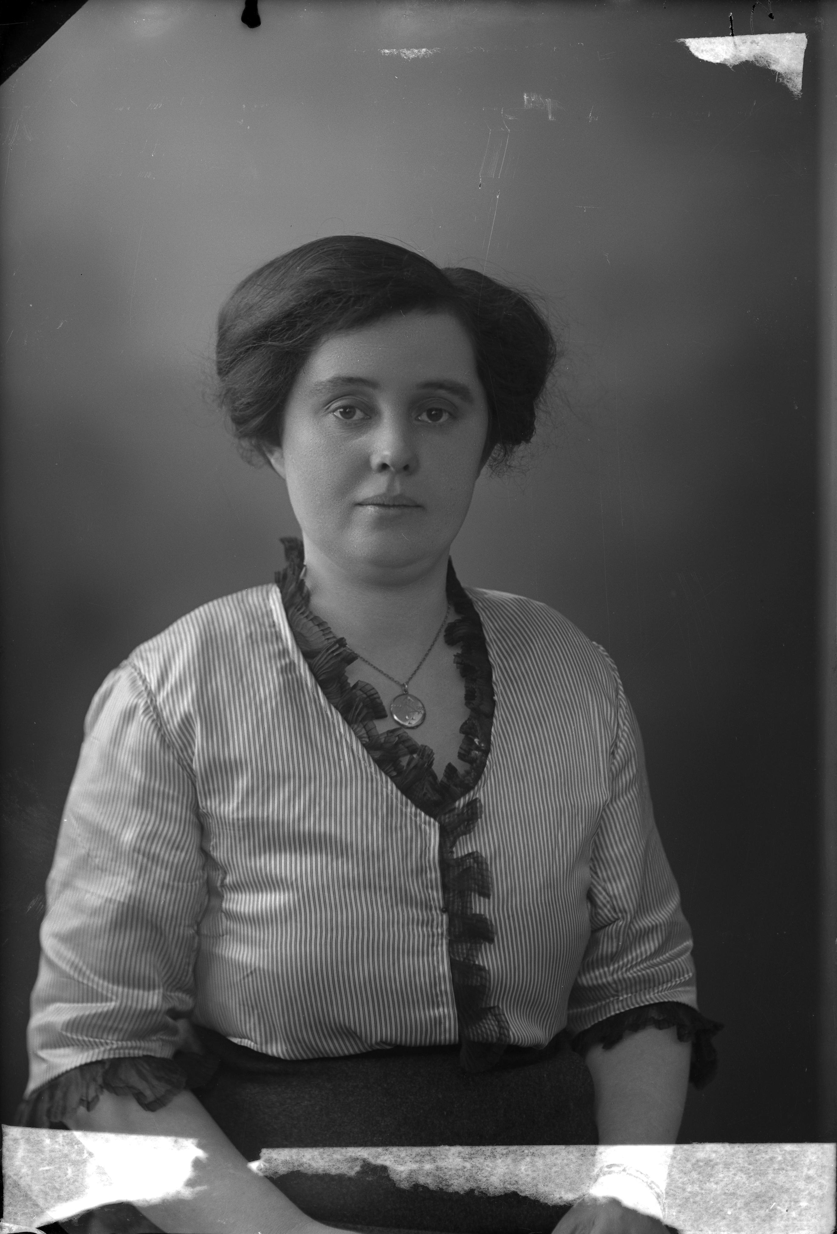 Porträtt i halvfigur av Erika Winslow, bärande halsband med berlock.