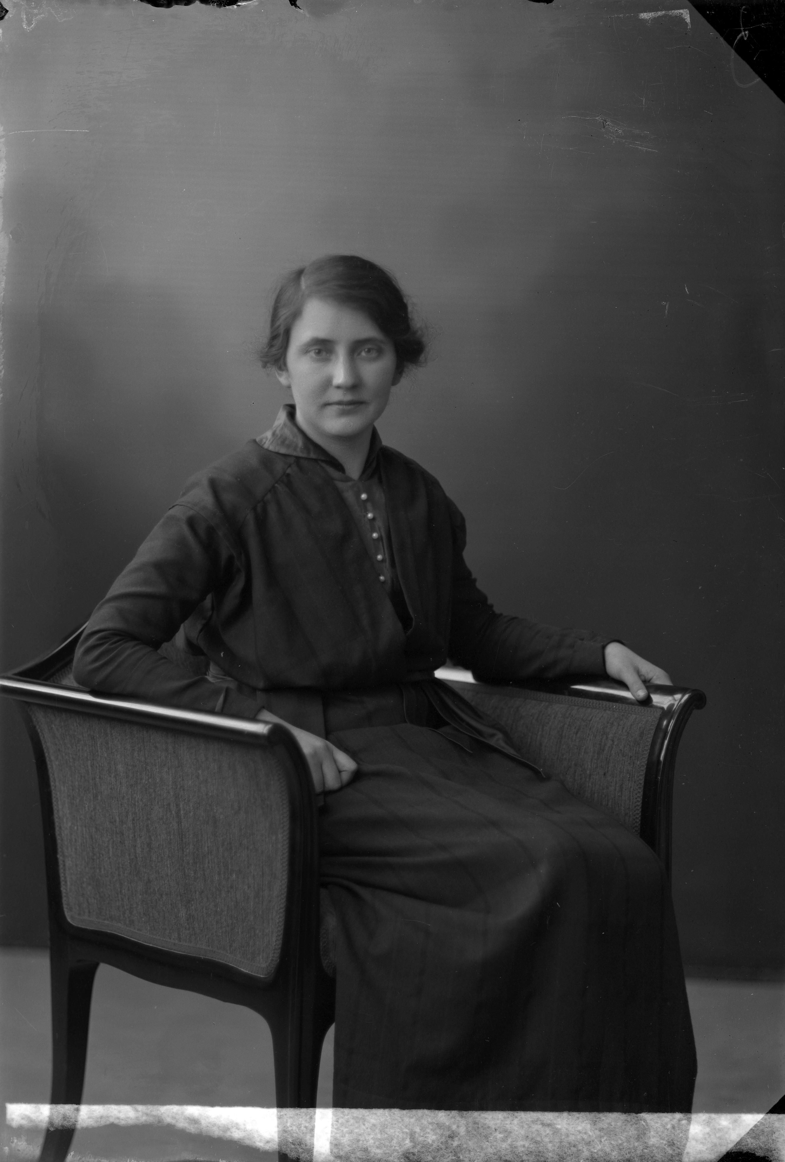 Porträtt i helfigur av Anna Blomberg, sittande i stol.