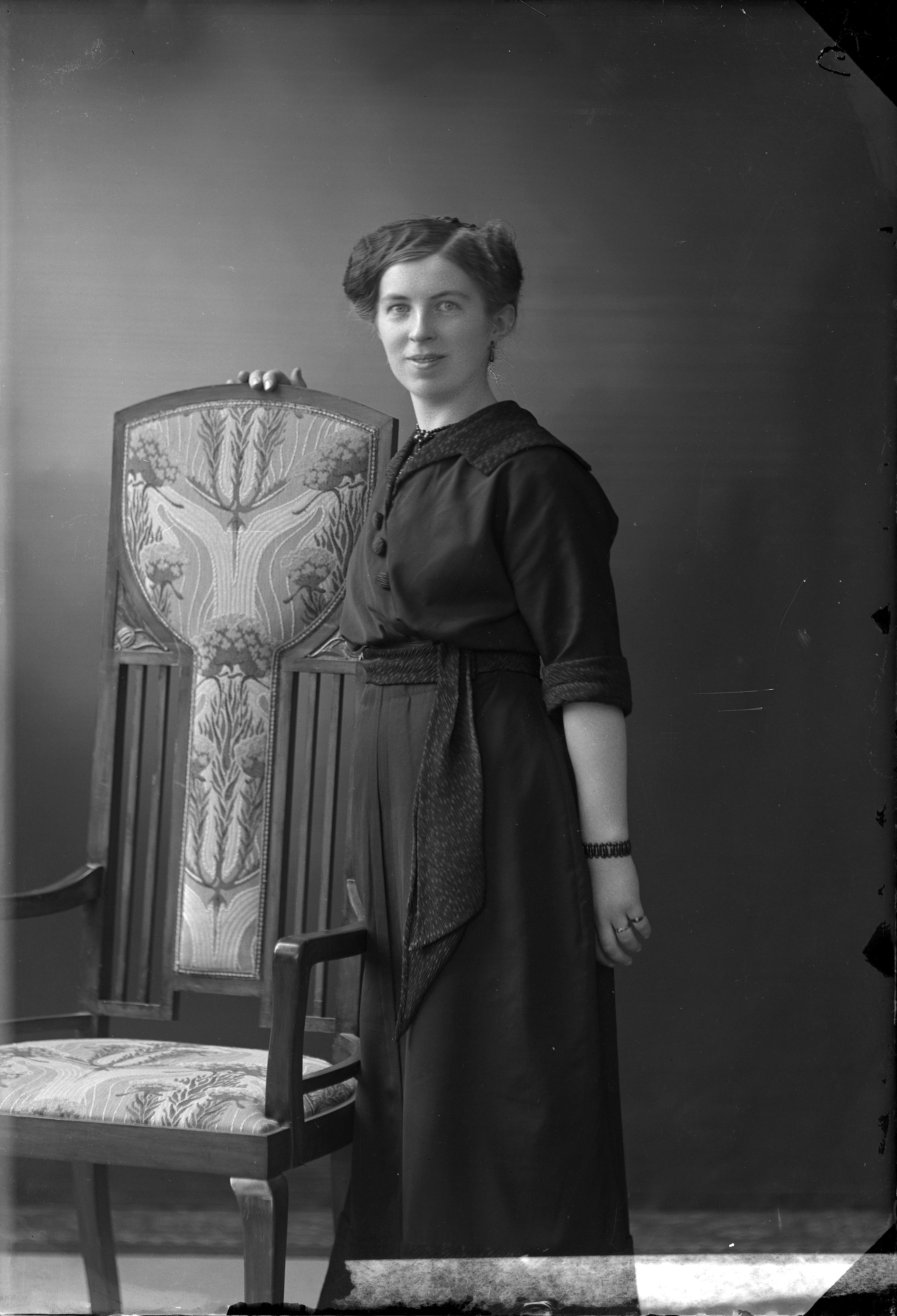 Porträtt i helfigur av Ella Larsson, stående vid stol.
