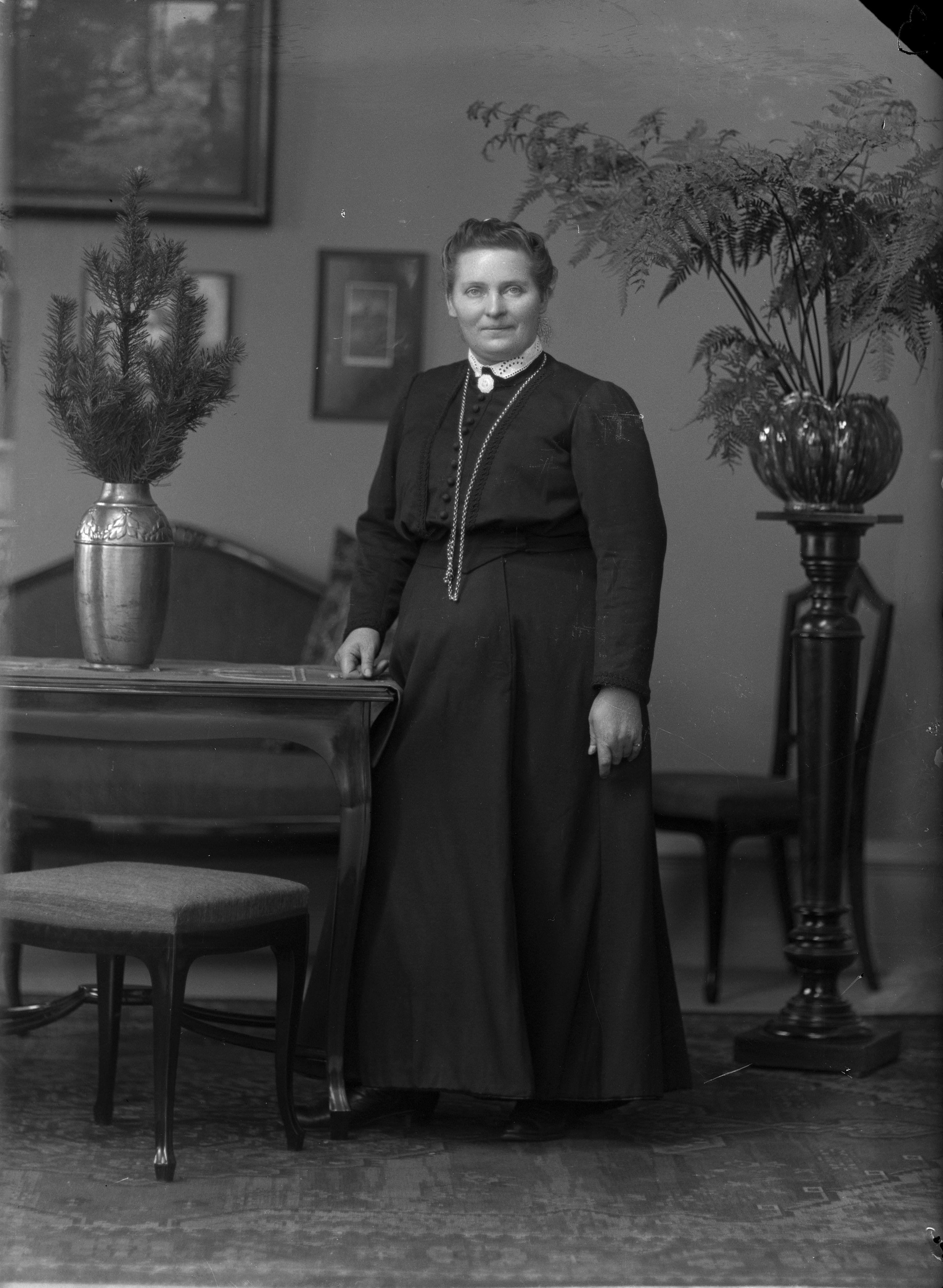 Porträtt i helfigur av Maria Jakobsson, stående i rumsinteriör.