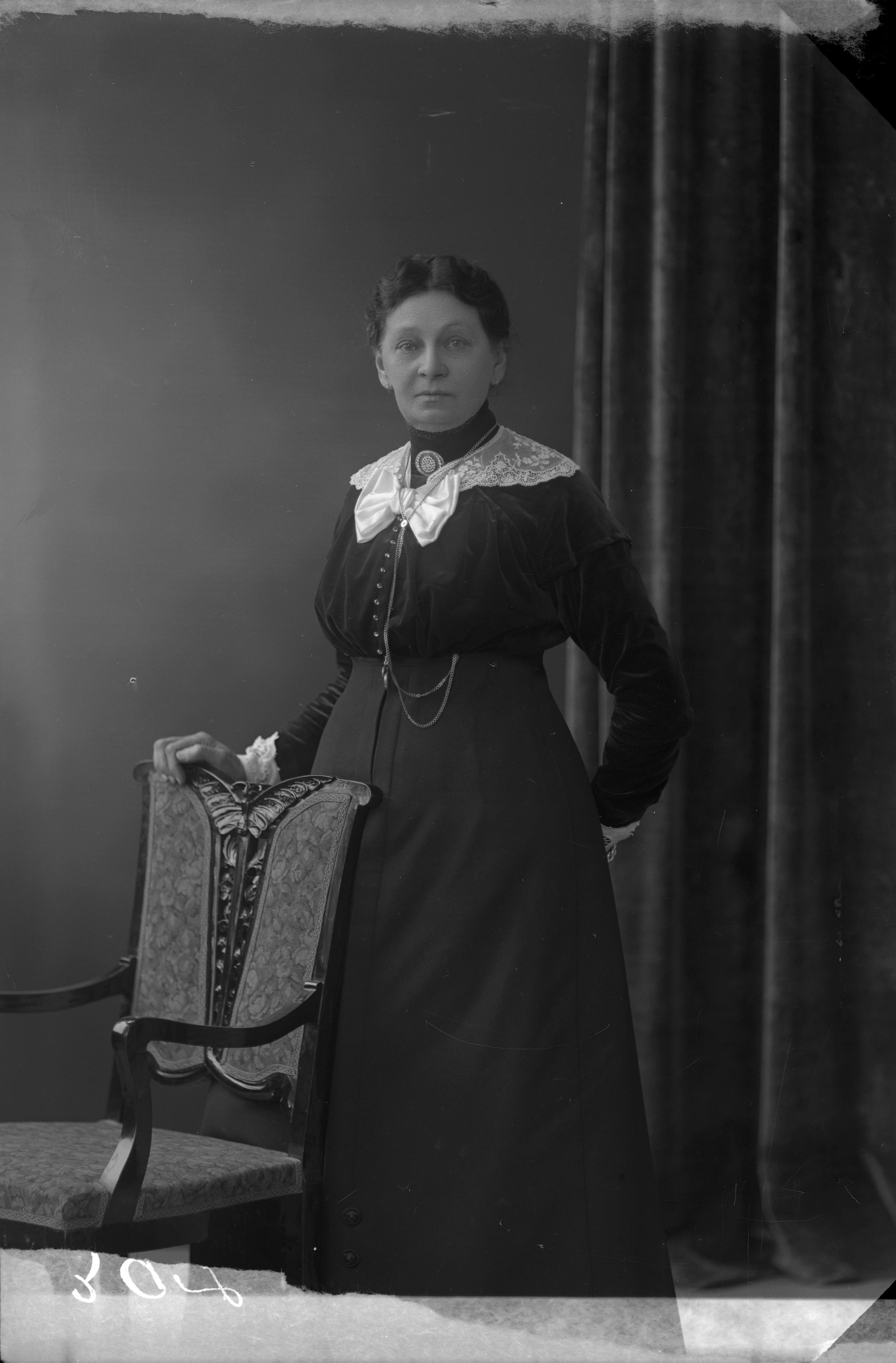 Porträtt i helfigur av Thilda Jönsson i långklänning, stående vid stol med draperi i bakgrunden.