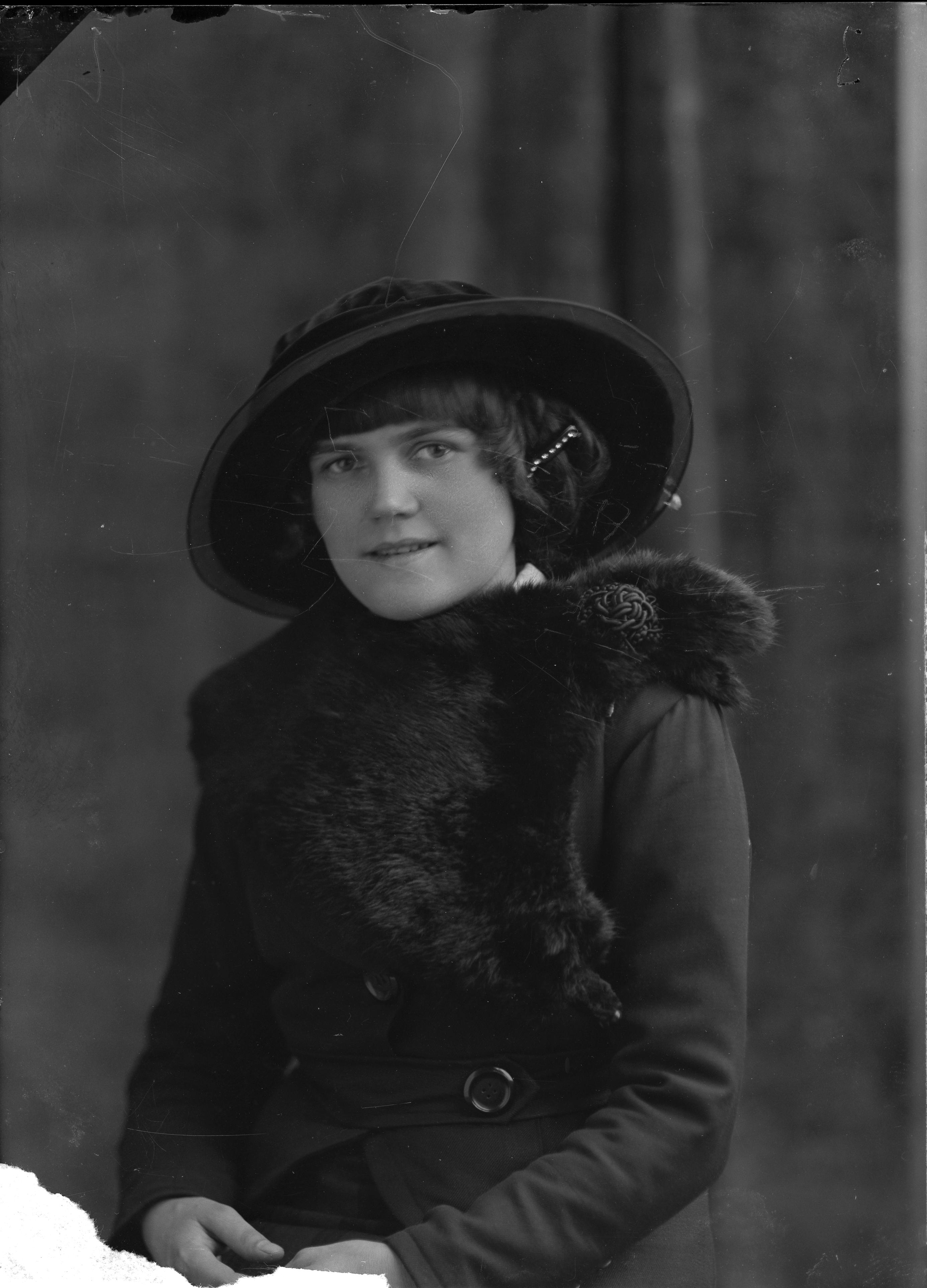 Porträtt i halvfigur av Ida Persson i bredbrättad hatt, ytterkappa samt päls.