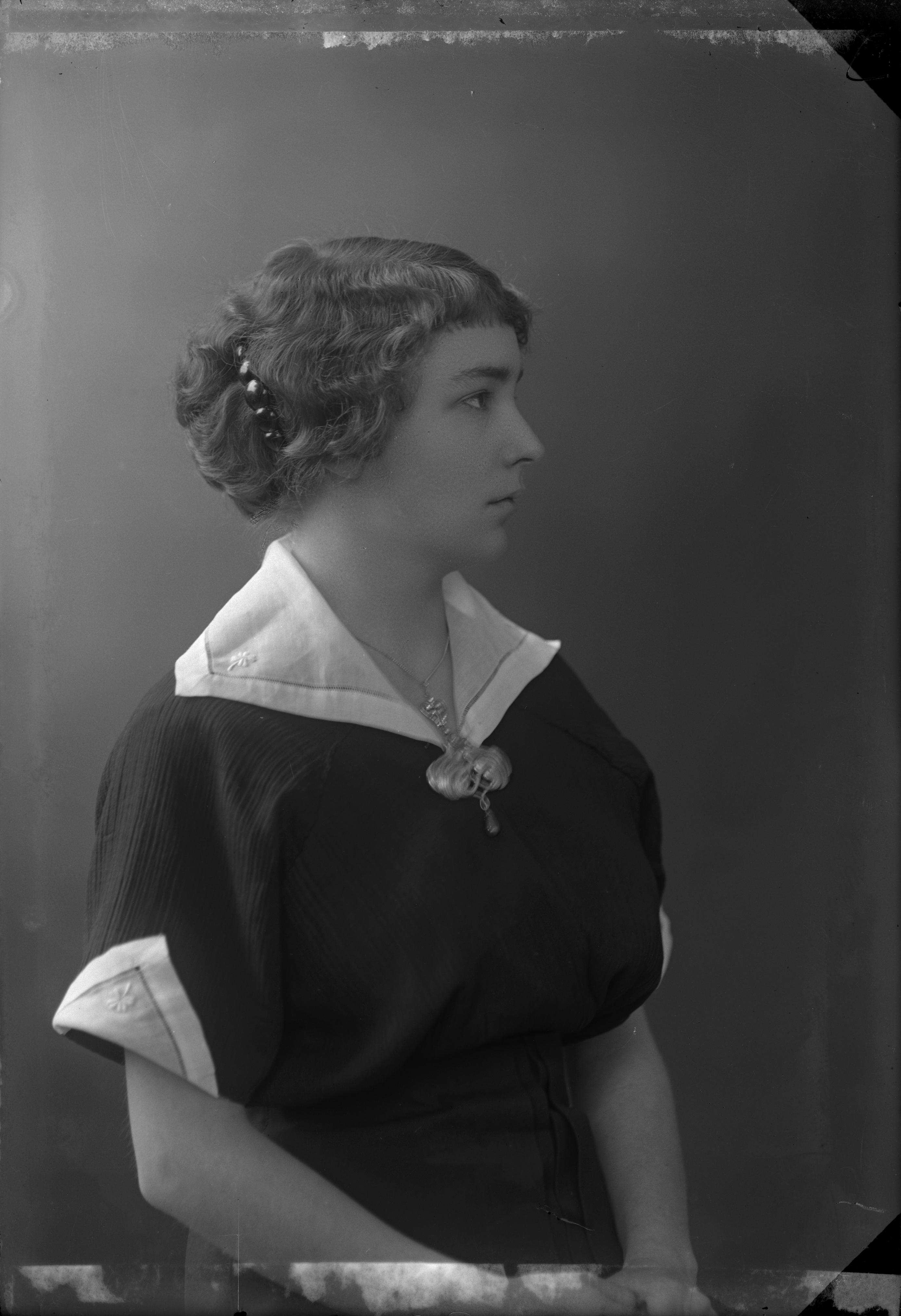 Porträtt i halvfigur av Gussi Flygare, ansikte i profil.