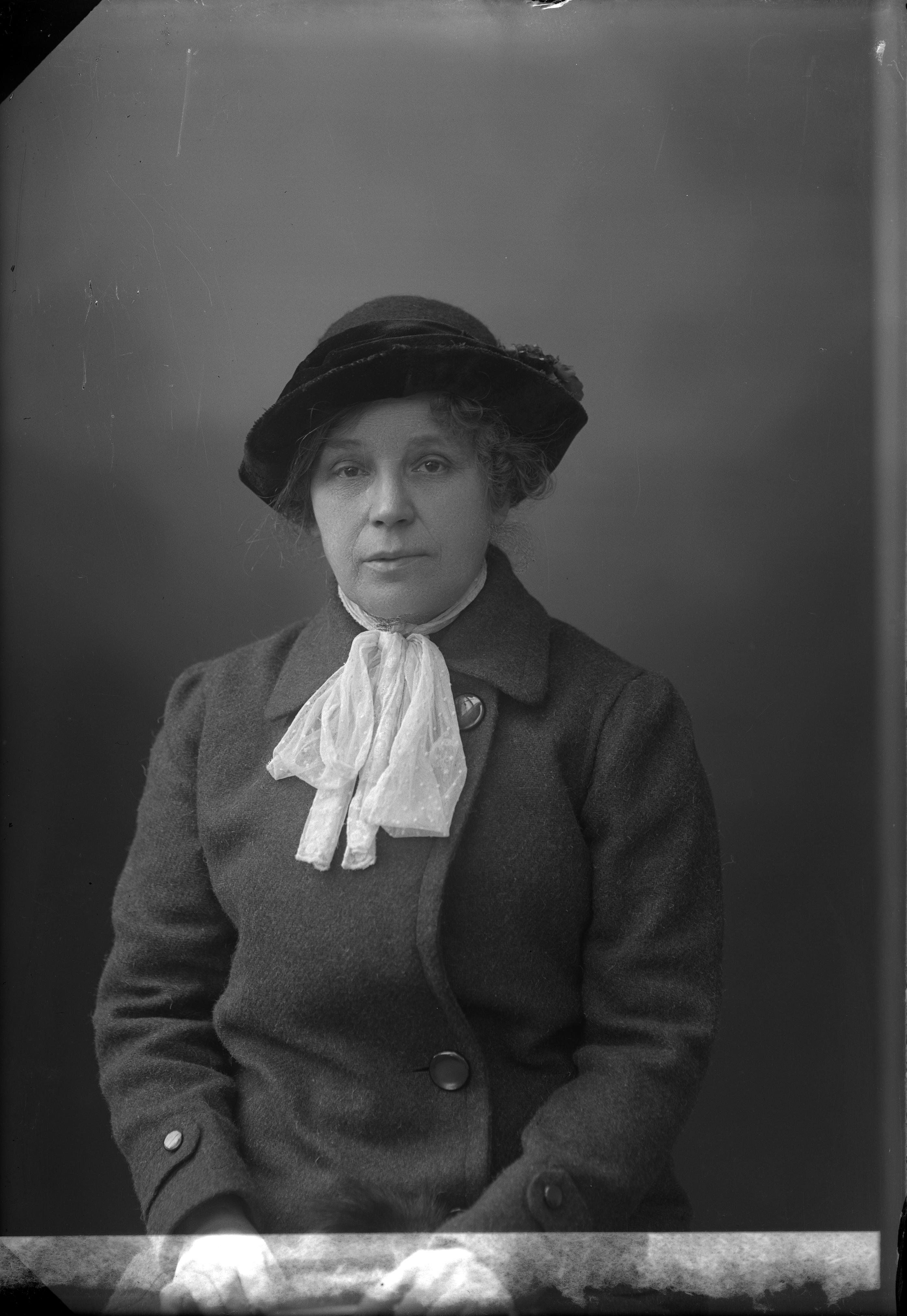 Beskrivning: Porträtt i halvfigur av freulein Hendrichs från Tyskland i damhatt och -kappa.