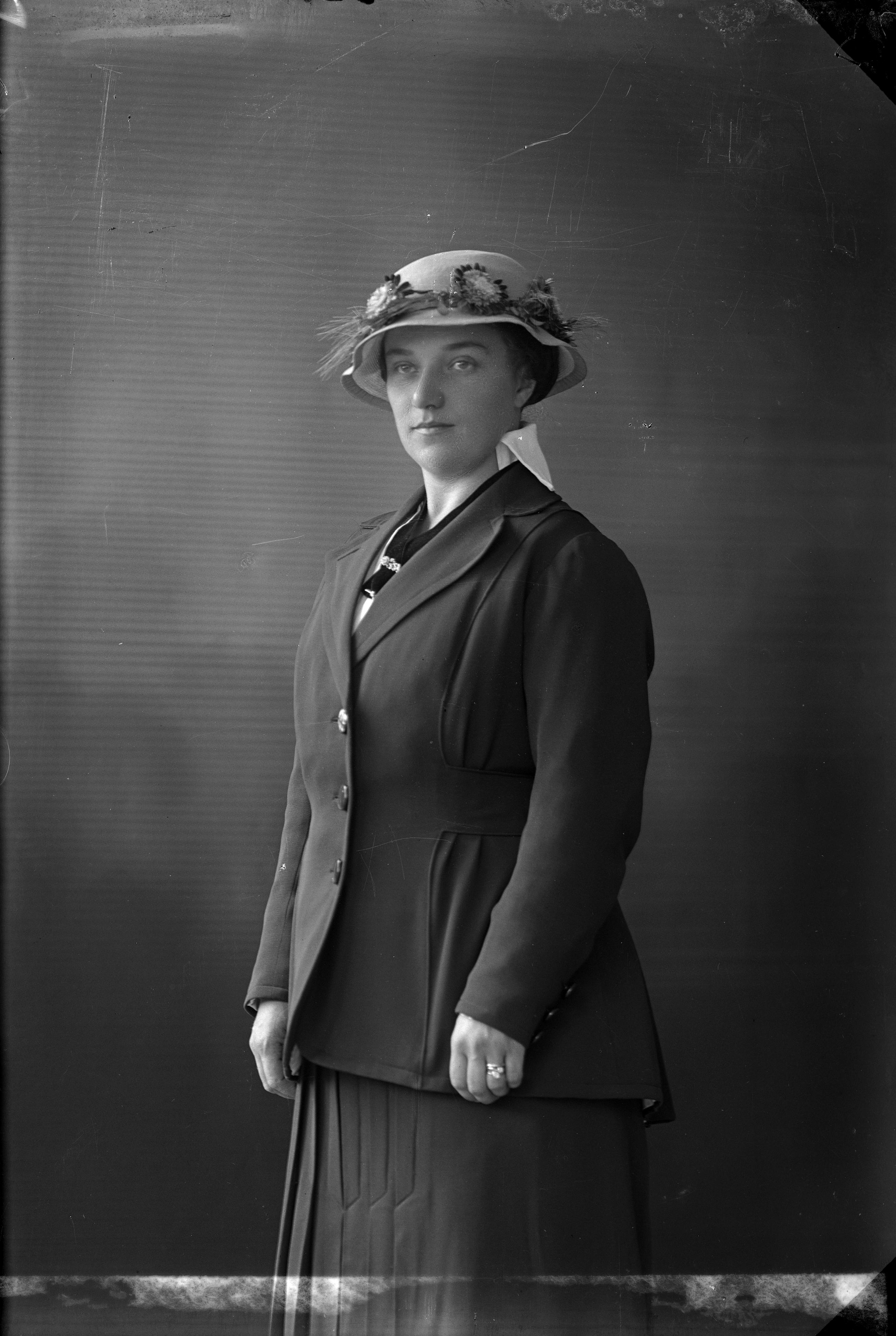 Beskrivning: Porträtt i helfigur av fru Trädgårdh i hatt och kappa.