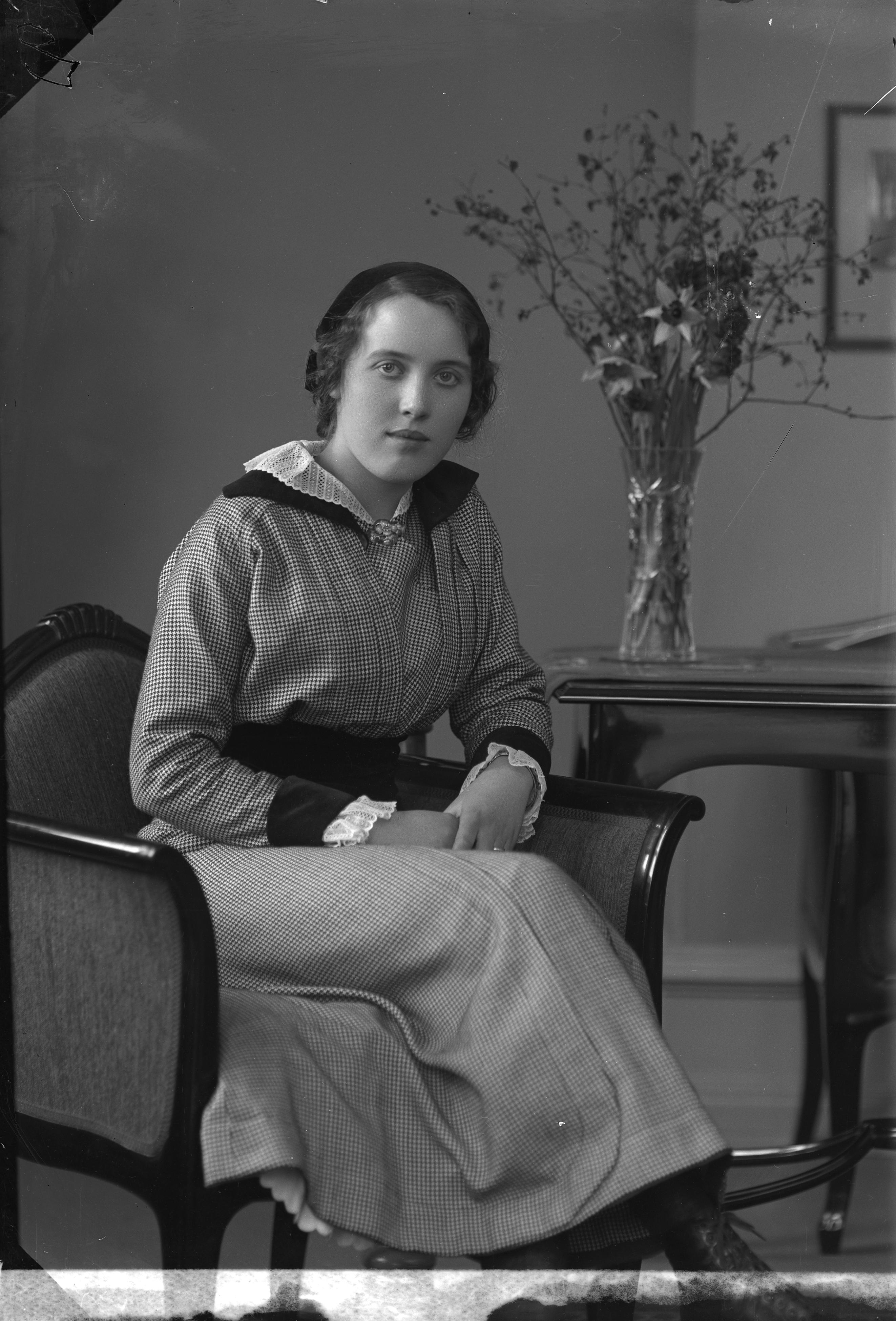 Porträtt i helfigur av Greta Bååth, sittande vid bord.