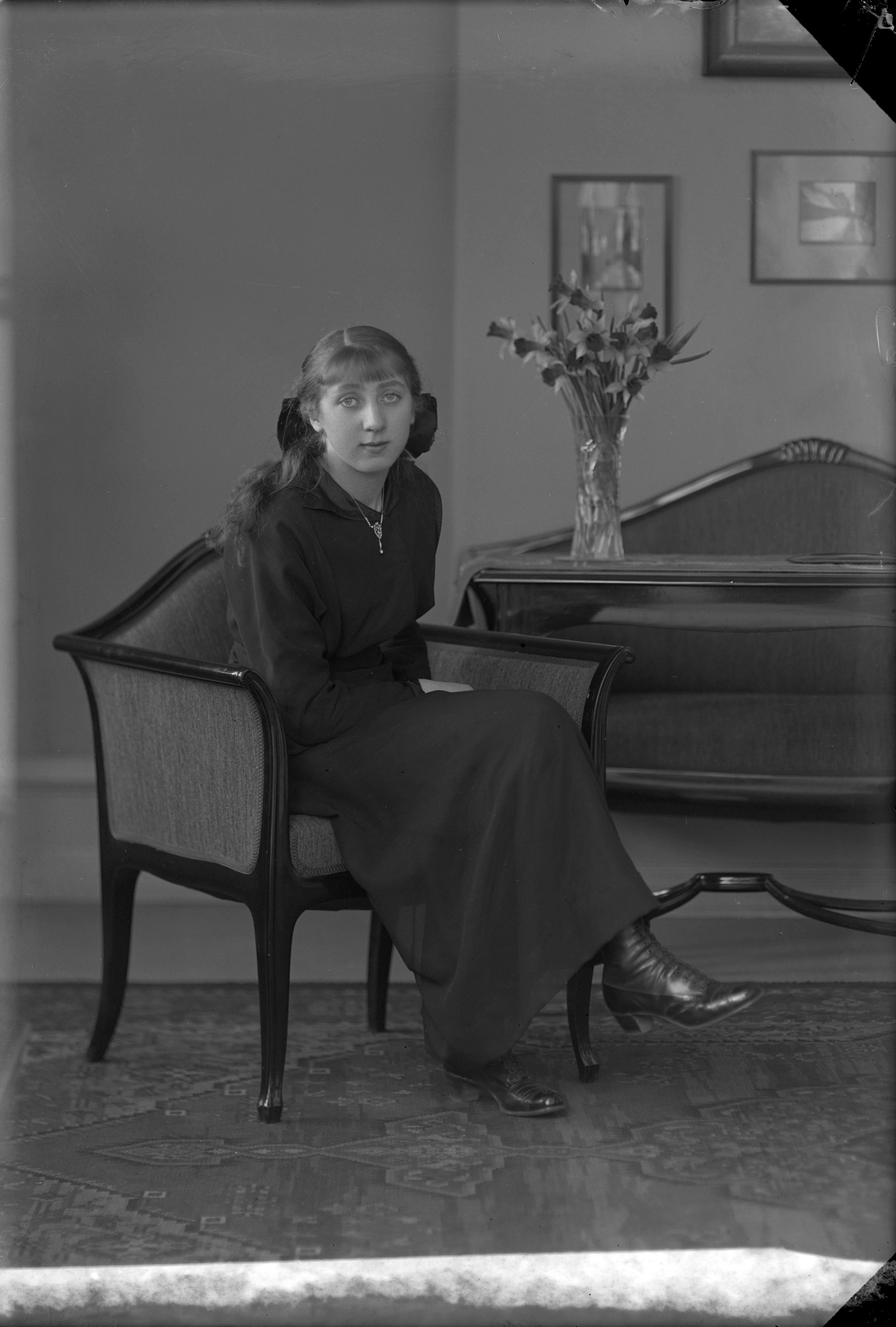 Porträtt i helfigur av Ellen Grönwall, sittande vid bord med blomvas.