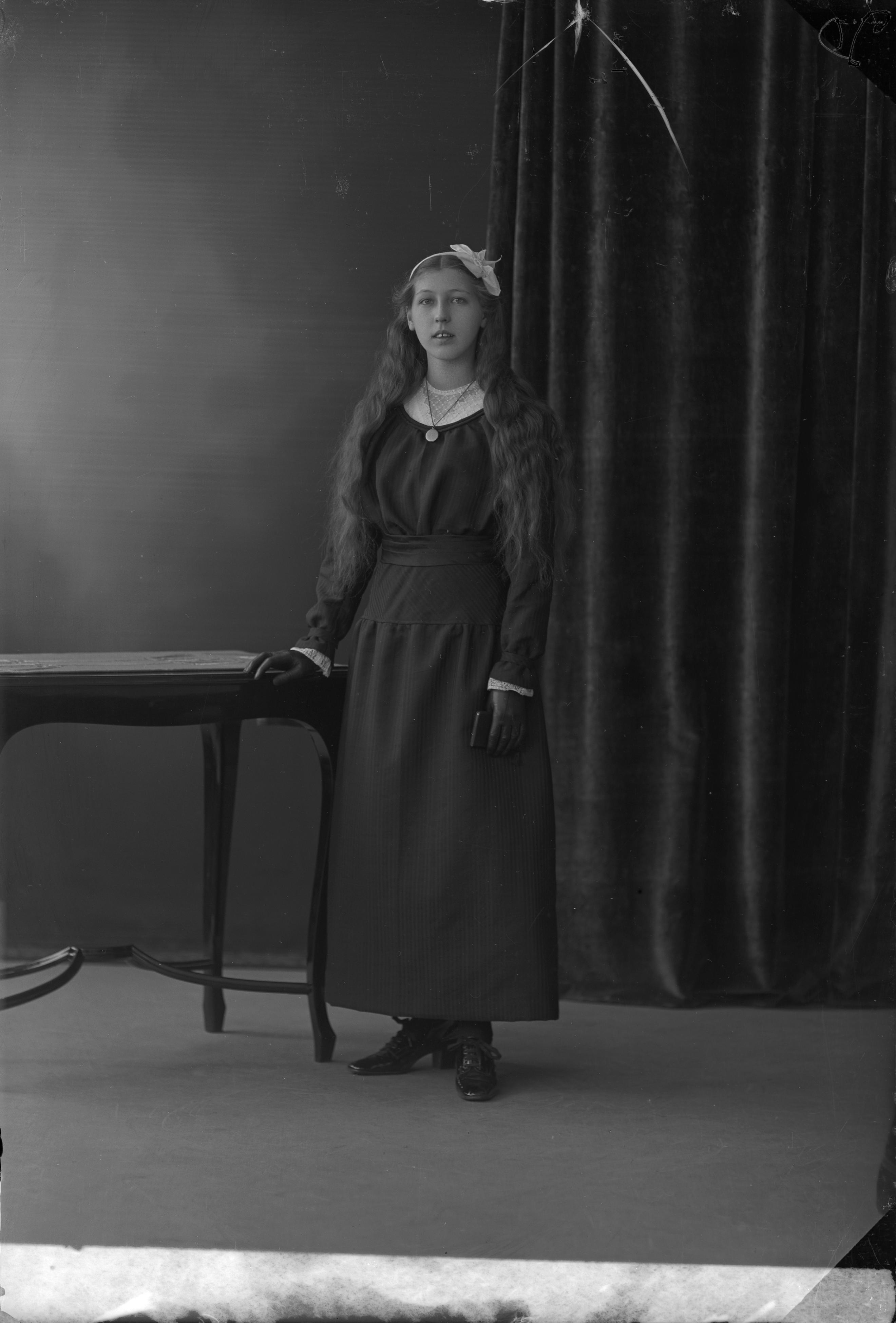 Beskrivning: Porträtt i helfigur av Ebba Mårtensson stående vid bord.