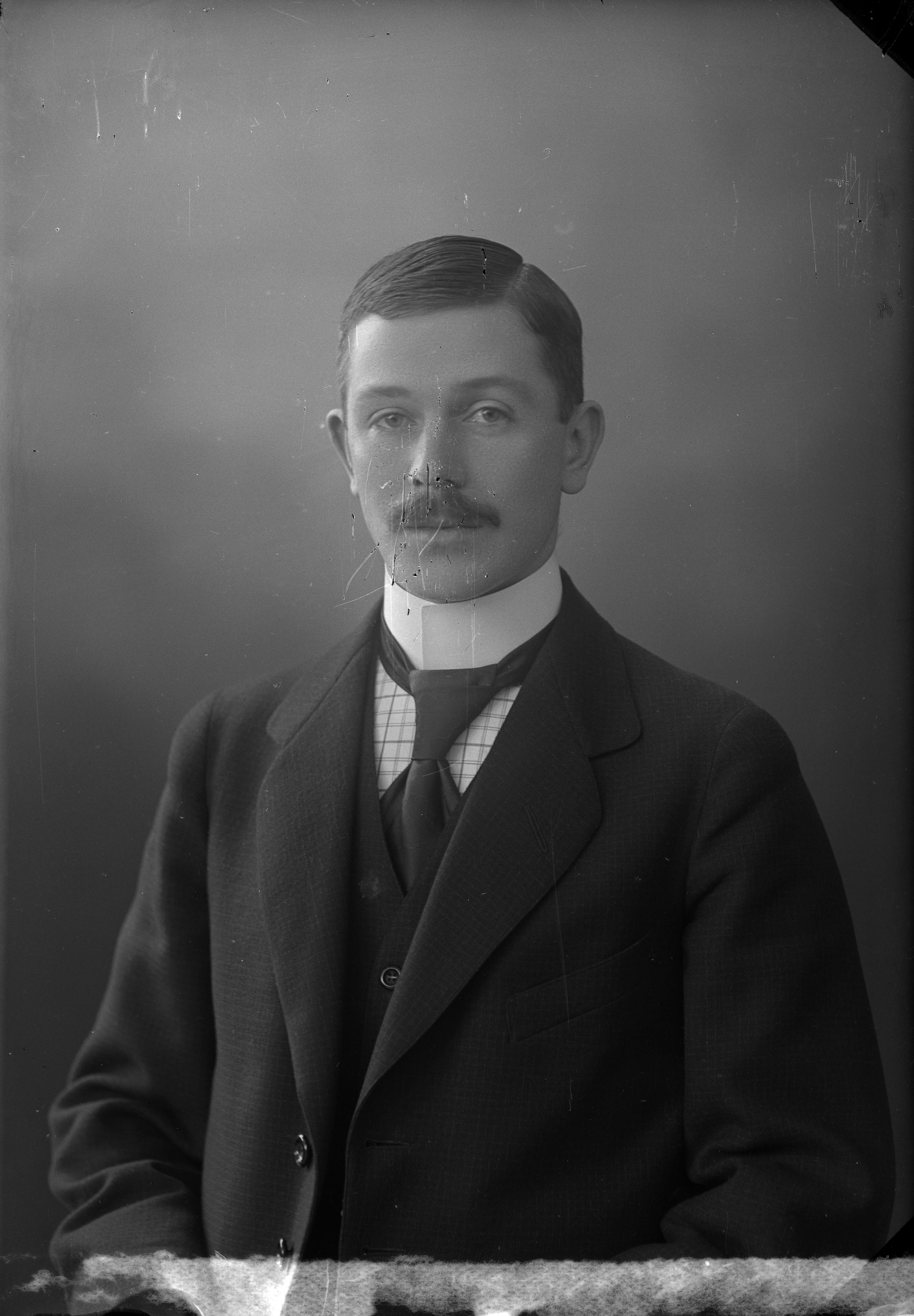 Beskrivning: Porträtt i halvfigur av banktjänsteman Gunnar Strandmark.