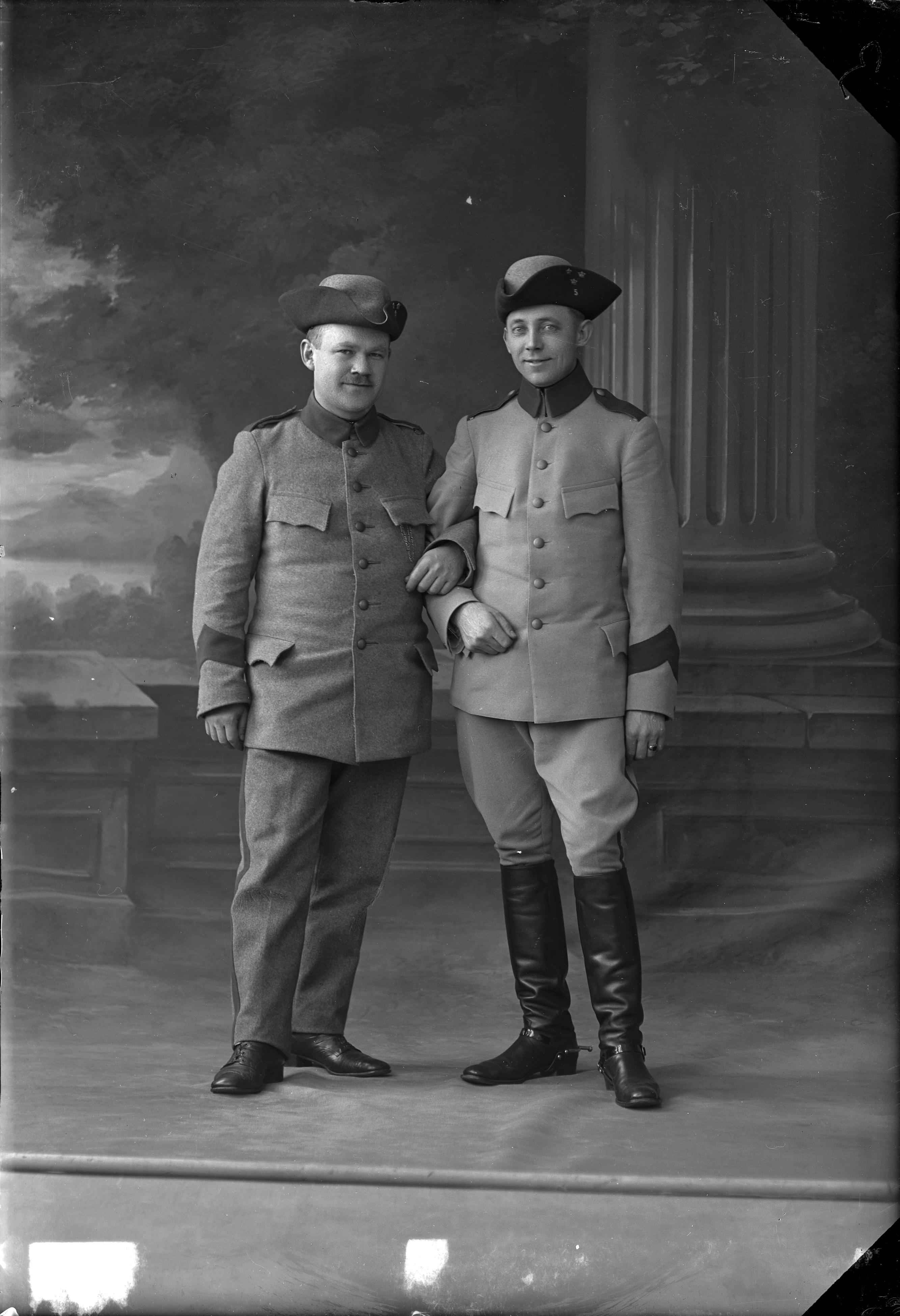 Porträtt i helfigur av handelsmännen Larsson och J. Göransson i uniform. Ateljéfond med pelarmotiv utgör bakgrunden.