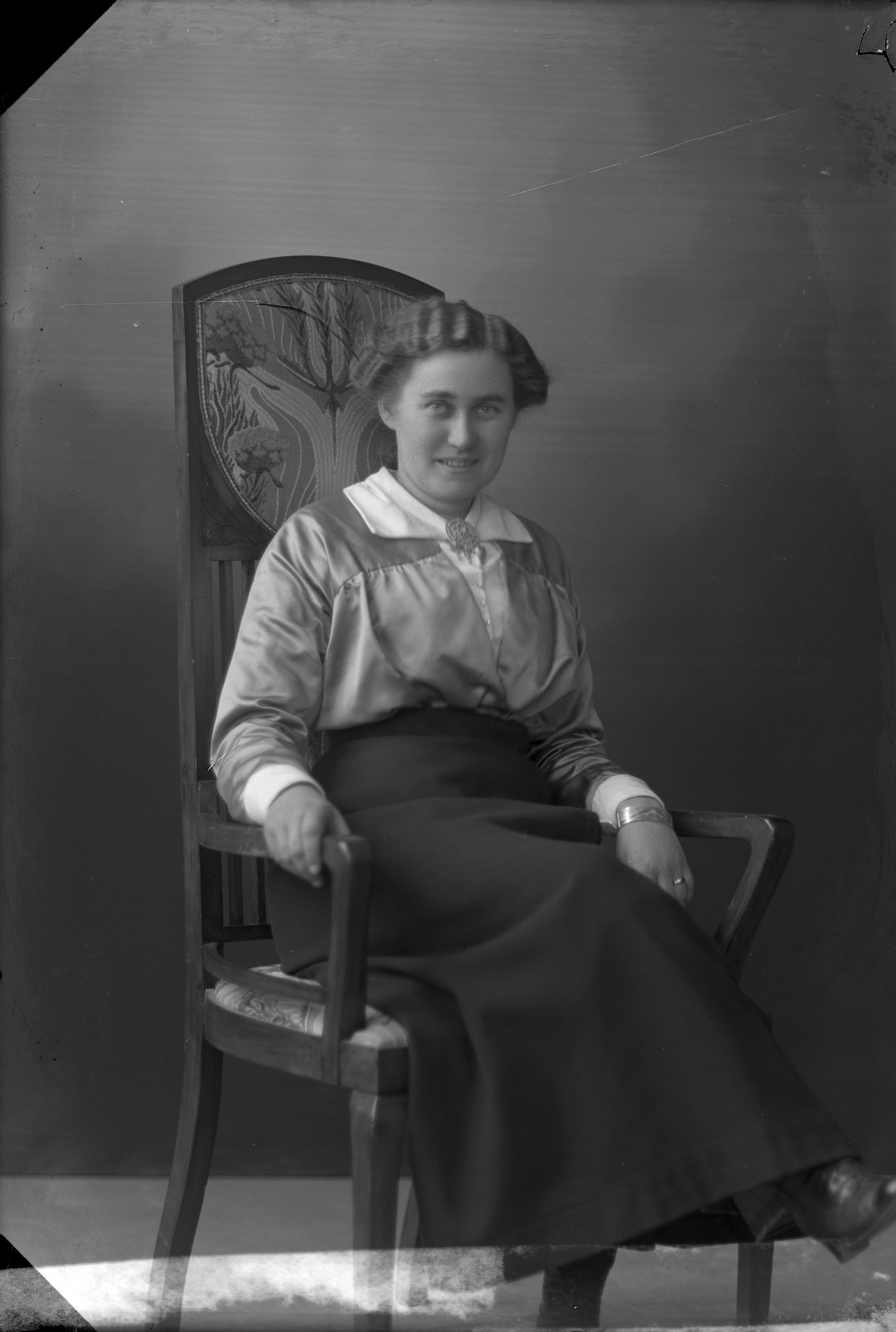 Porträtt i helfigur av Maria Andersson, sittande i stol.