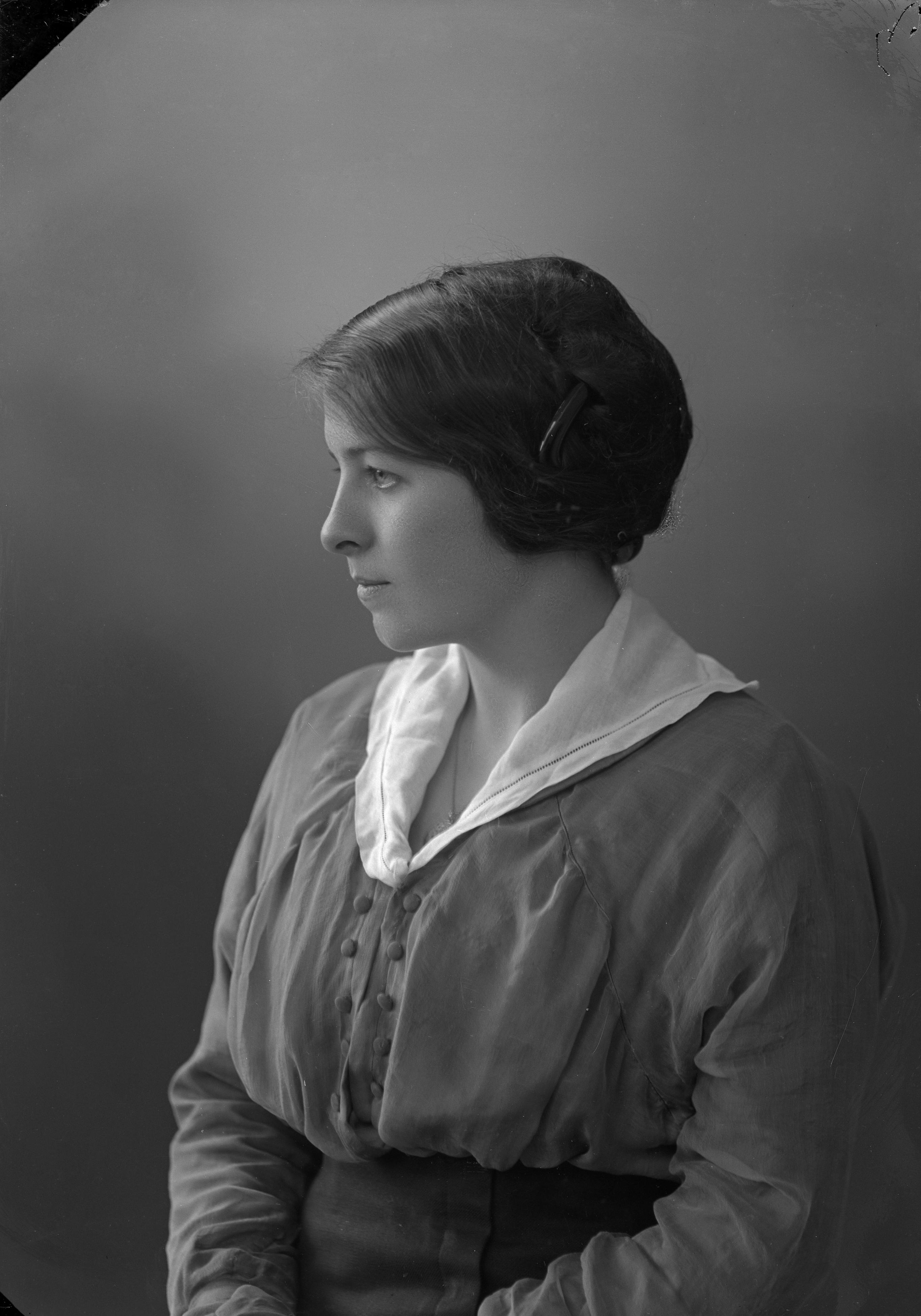 Porträtt i halvfigur av Hilma Askelund, ansikte i profil.