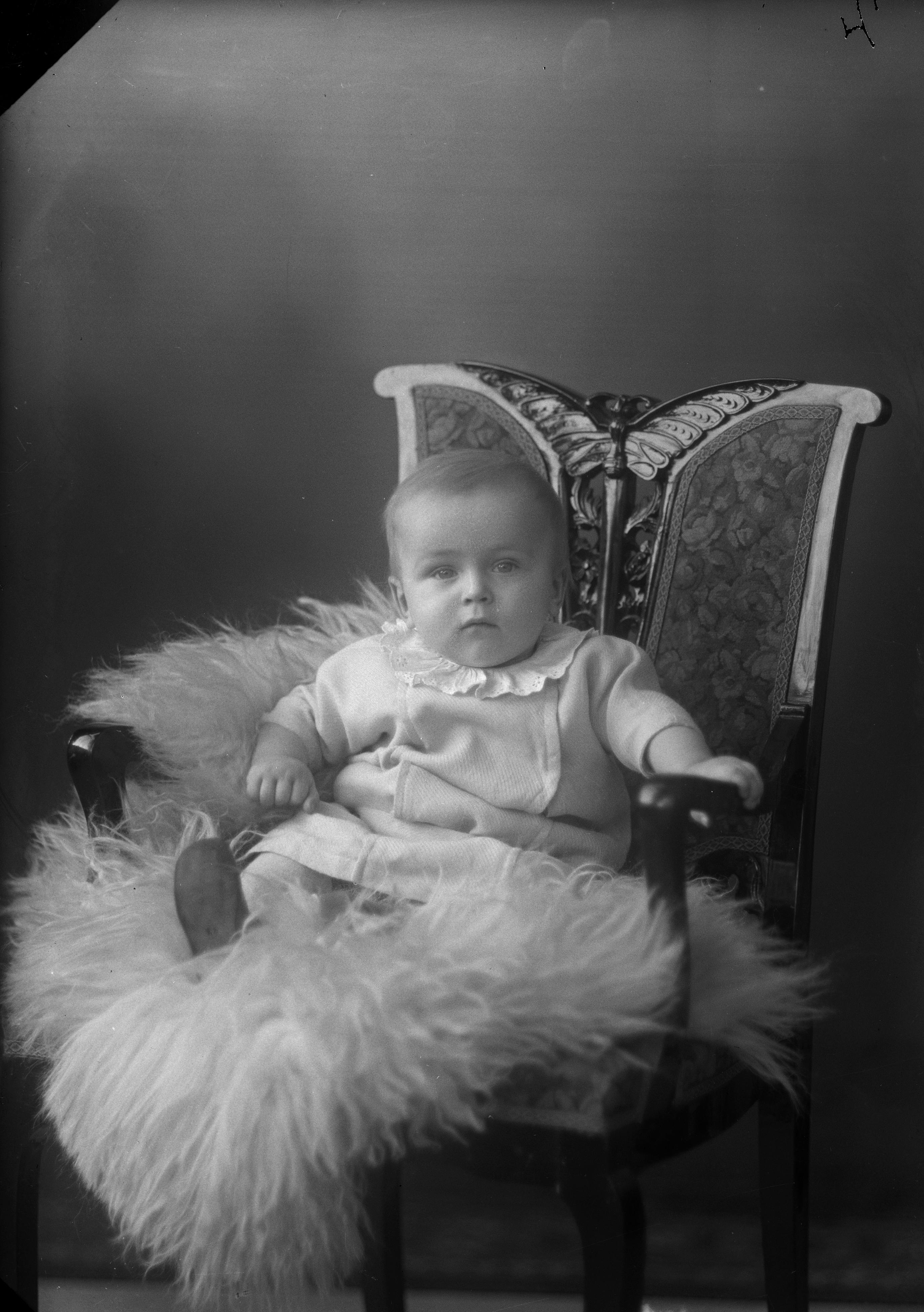 Porträtt i helfigur av disponent Krasses barn sittande på fäll, lagd på stol.