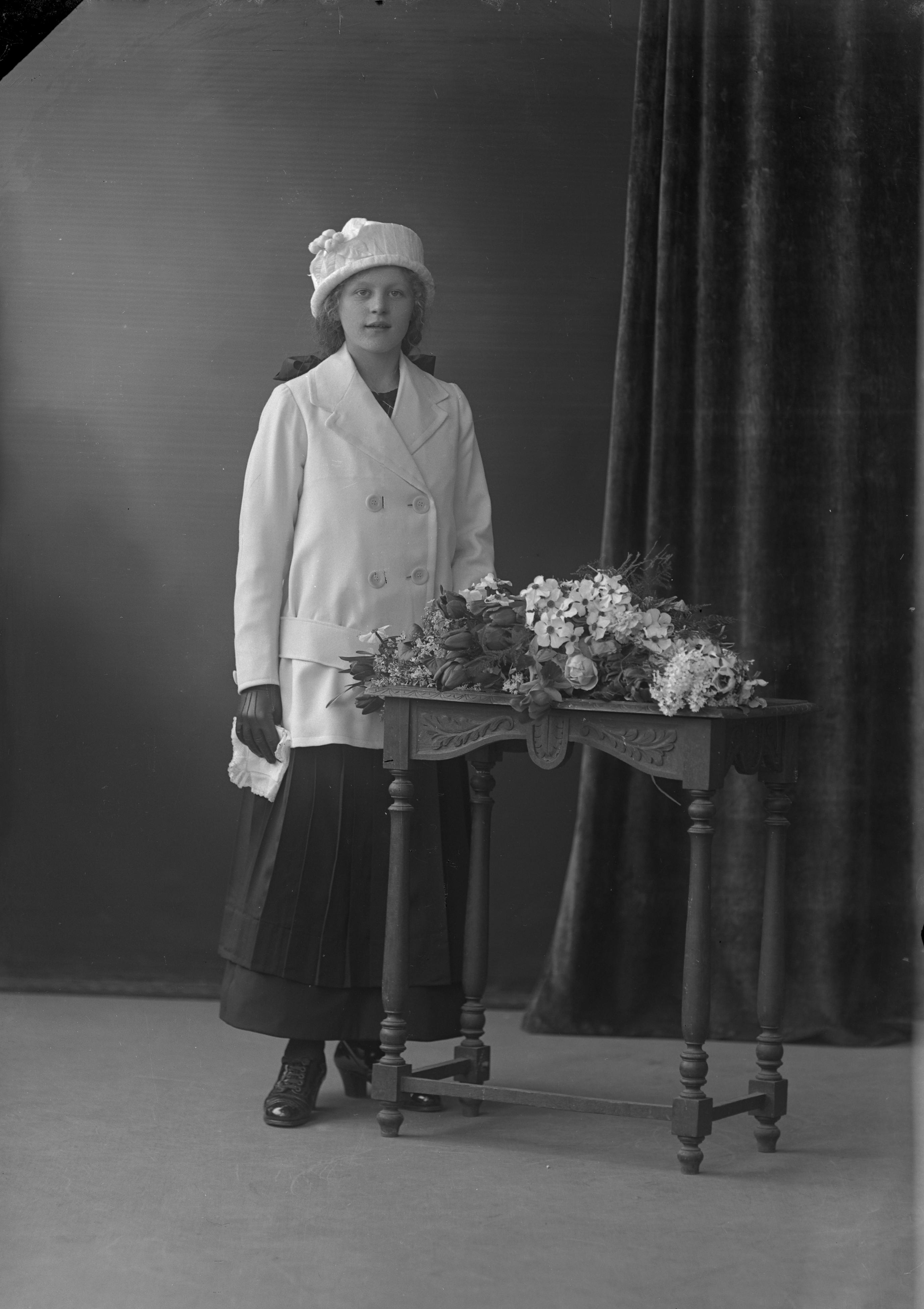 Porträtt i helfigur av oidentifierad kvinna i hatt och kappa, stående vid bord med blommor.