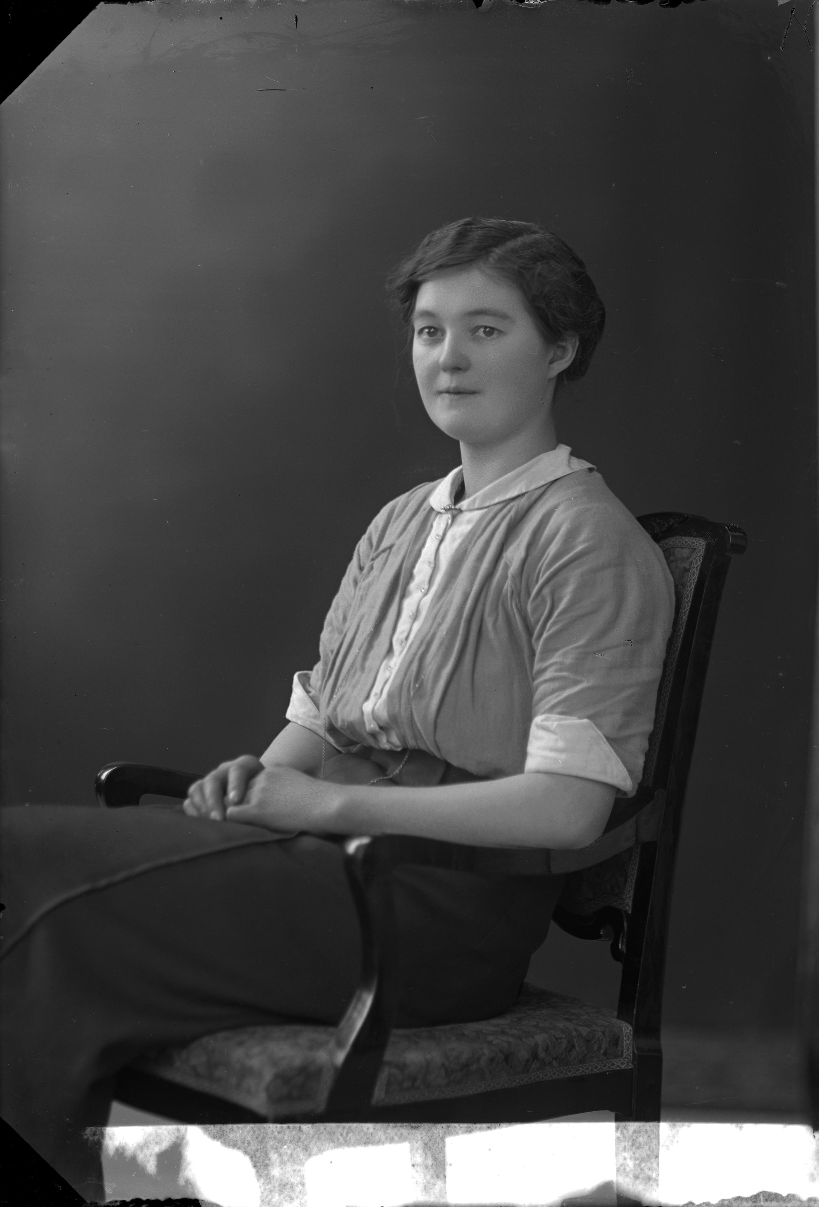 Porträtt i helfigur av Anna Olsson, sittande i stol.