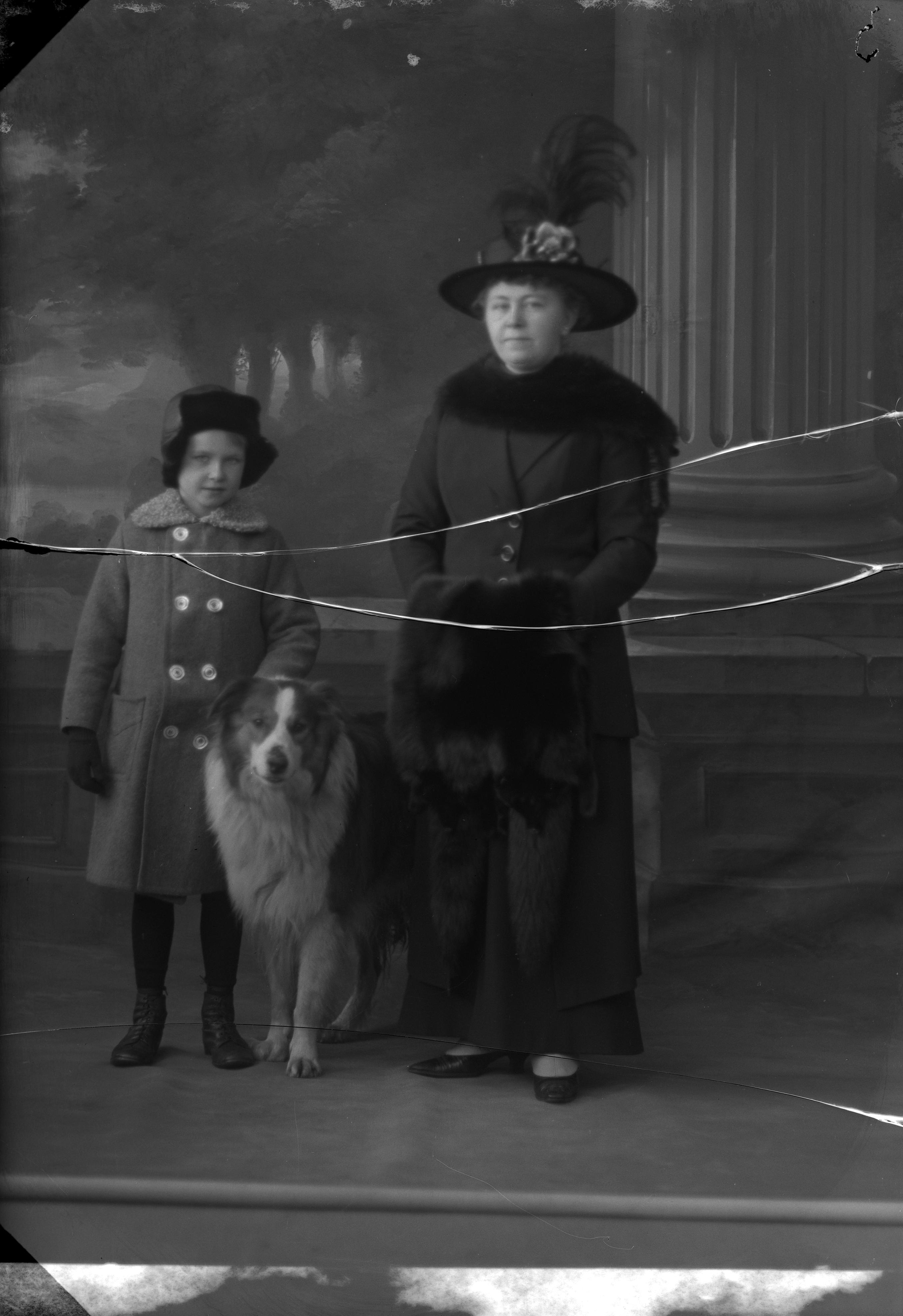 Porträtt i helfigur av fru Brand med sitt barn. Hon i hatt och kappa, barnet i mössa och ytterkläder. Ateljéfond med pelarmotiv och parkmiljö utgör bakgrunden.